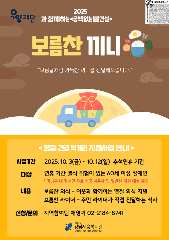 강남세움복지관과 우양재단이 함께하는 2025 공백없는 빨간날 명절 긴급 먹거리 지원사업 참여자를 모집합니다.