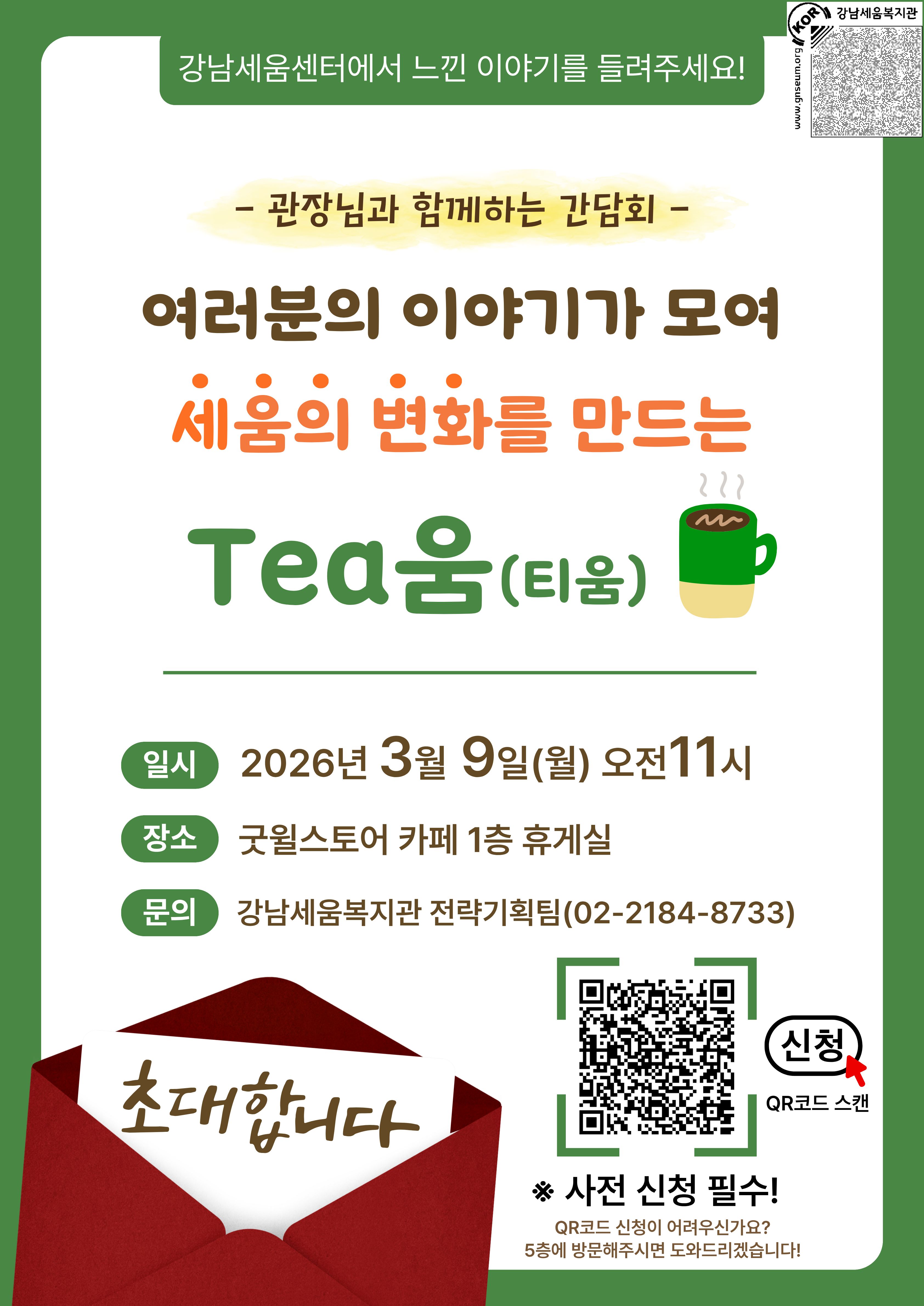 여려분의 이여기가 모여 세움의 변화를 만드는 Tea움(티움)에 초대합니다.