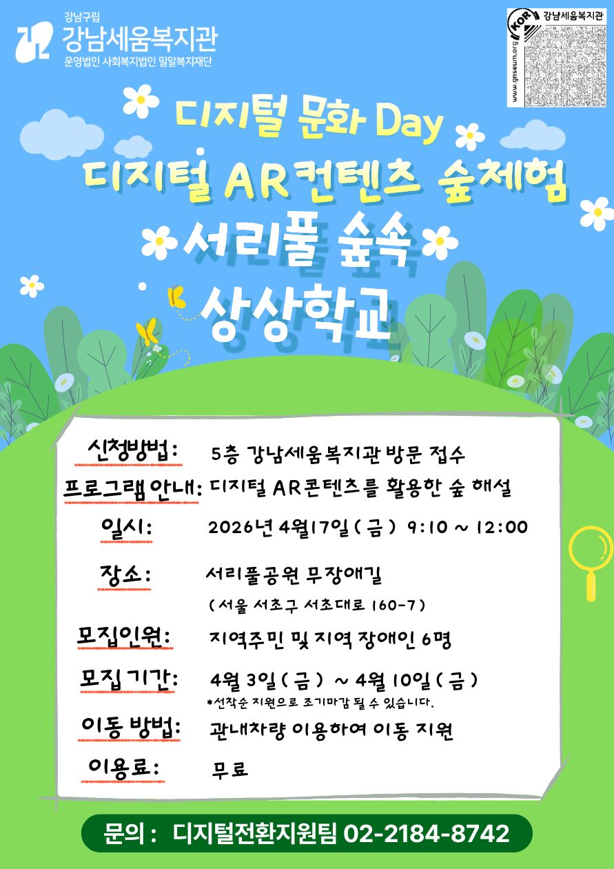 - 사업명: 디지털문화DAY ‘디지털 AR 컨텐츠 숲 체험’ 서리풀 숲속 상상학교