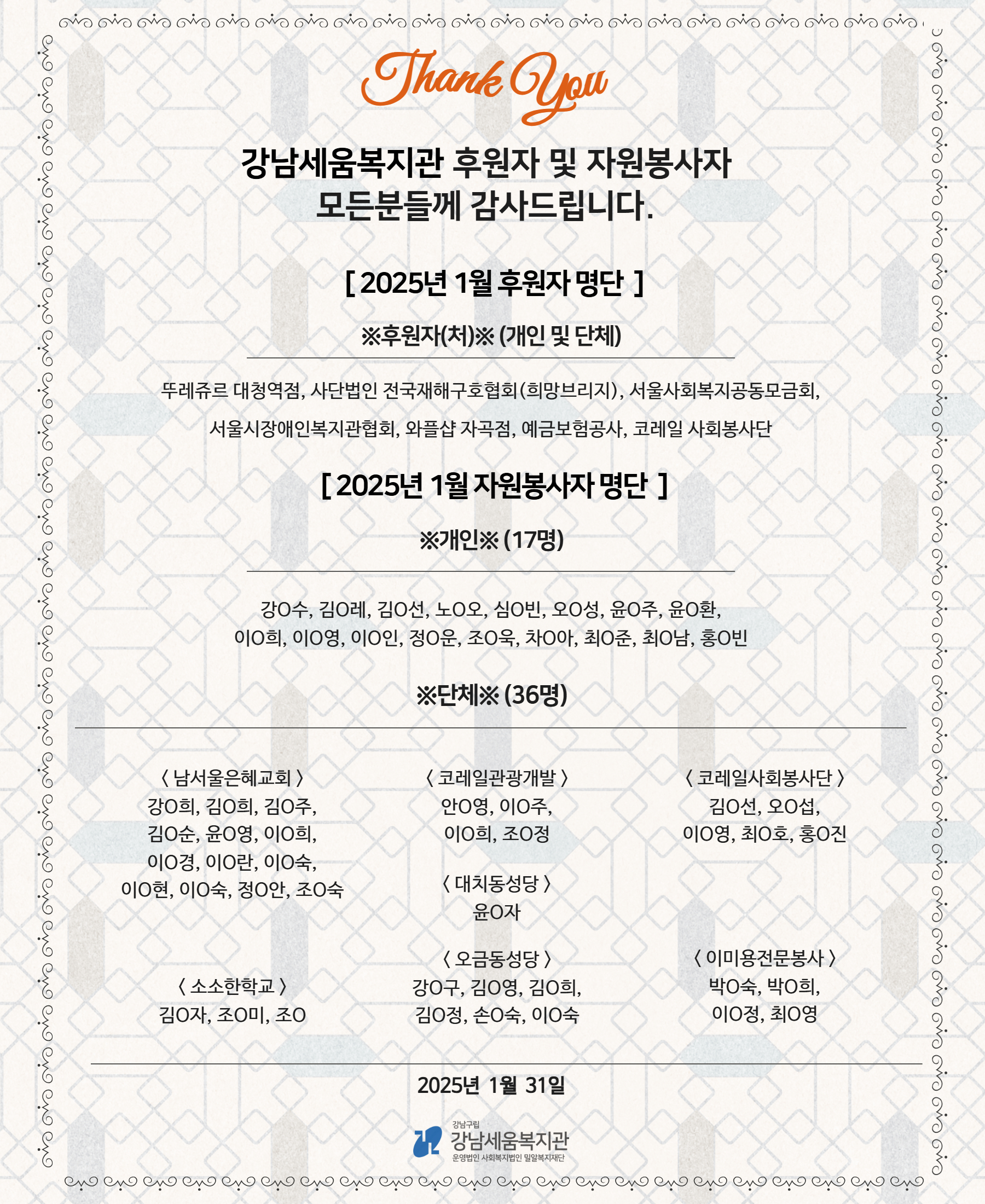 2) 단체 36명 : 강O희, 김O희, 김O주, 김O순, 윤O영, 이O희, 이O경, 이O란, 이O숙, 이O현, 이O숙, 정O안, 조O숙, 김O자, 조O미, 조O현, 안O영, 이O주, 이O희, 조O정, 윤O자, 강O구, 김O영, 김O희, 김O정, 손O숙, 이O숙, 김O선, 오O섭, 이O영, 최O호, 홍O진, 박O숙, 박O희, 이O정, 최O영