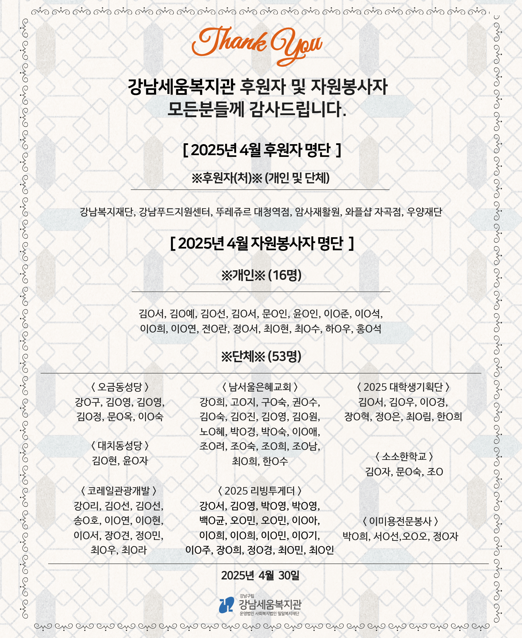 ◇ 장애인이 스스로 사회에 자신을 세워나갈 수 있도록 지원해주신 후원자 및 자원봉사자분들과 강남세움복지관이 함께 ‘나눔과 봉사’를 실천할 수 있습니다.