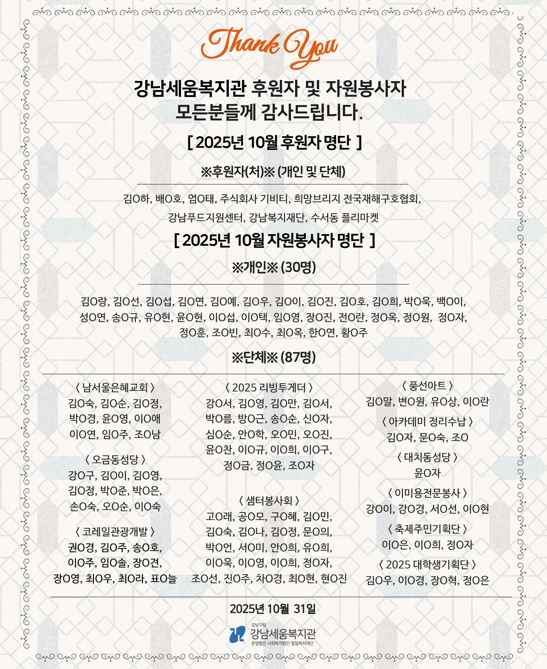 1)개인 및 단체 : O, O, O, 주식회사 기비티, 희망브리지 전국재해구호협회, 강남푸드지원센터, 강남복지재단, 수서동 플리마켓