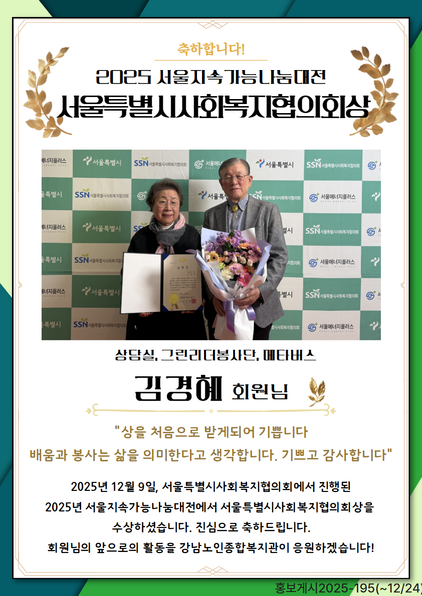 2025년 서울지속가능나눔대전 서울특별시사회복지협의회장상 수상(김경혜 회원님)