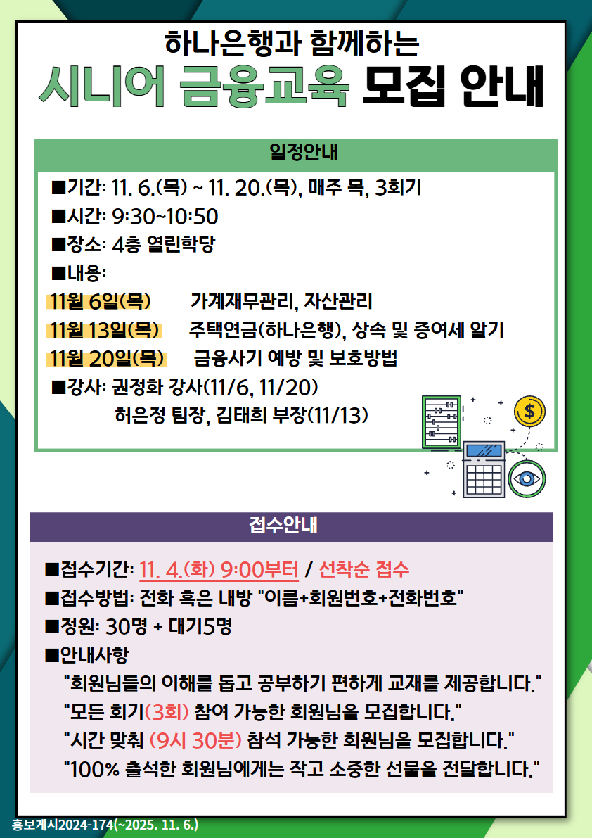| 회원님들이 스스로의 자산을 안전하게 관리하고 금융사기 위험으로부터 자신을 보호할 수 있는 방법을 알려주는 교육을 진행합니다! |
