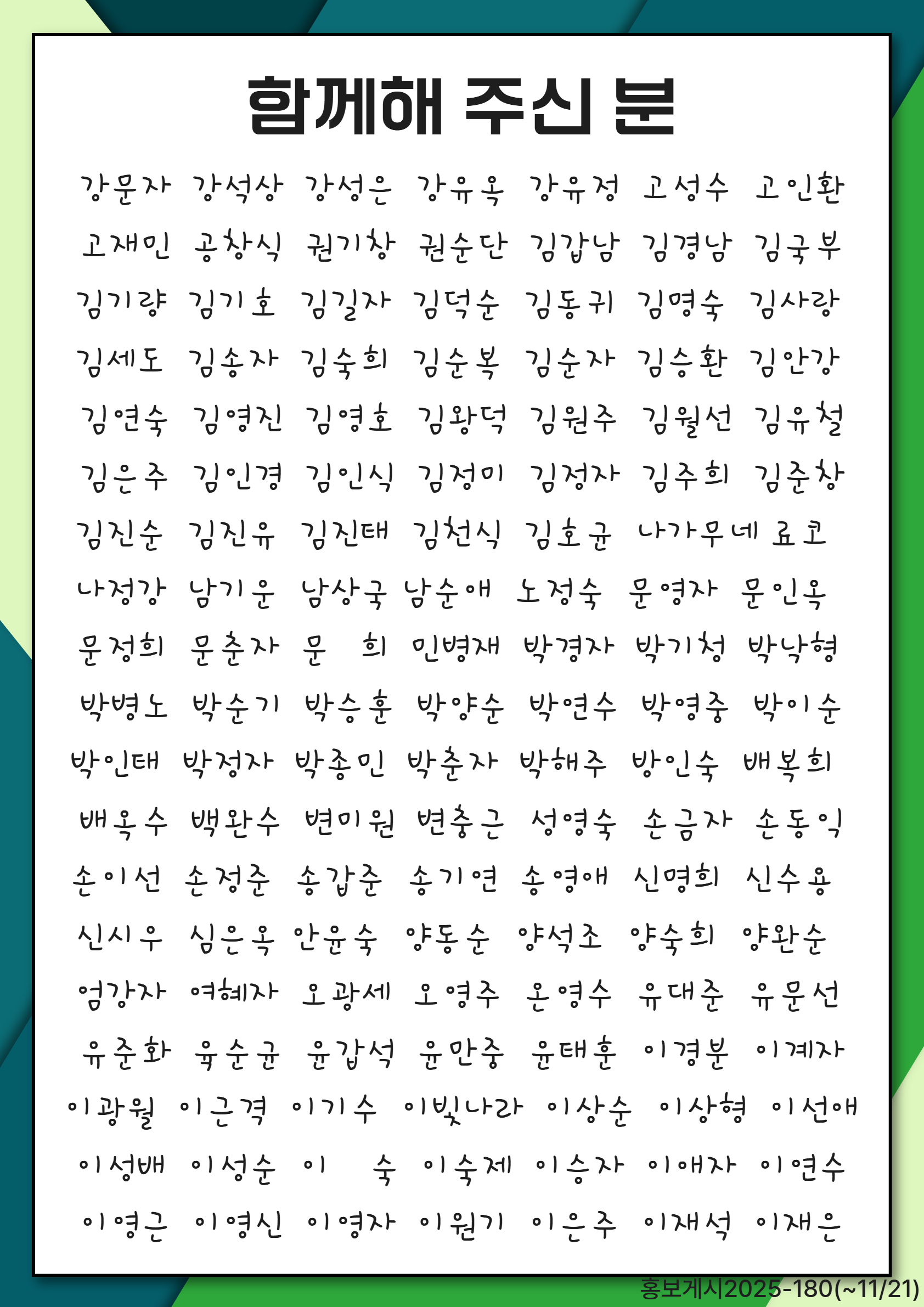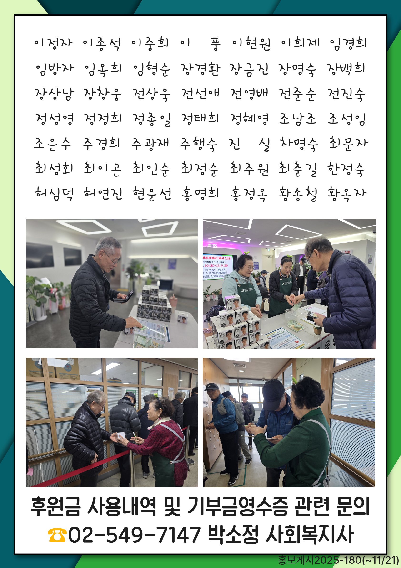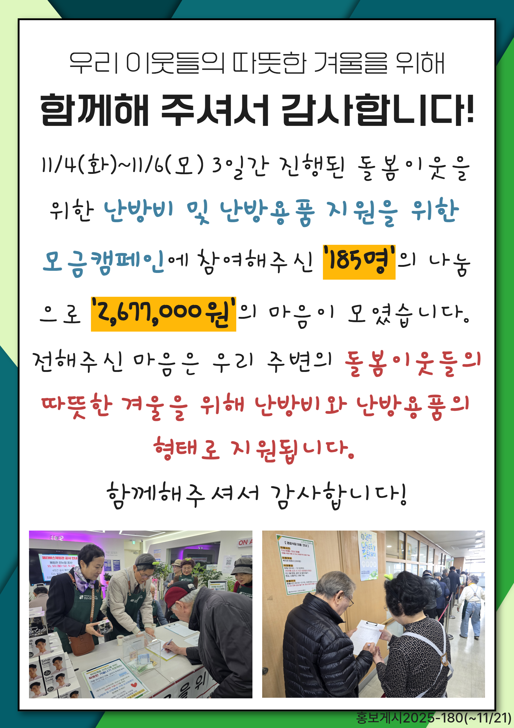 | 11/4(화)~11/6(모) 3일간 진행된 돌봄이웃을 위한 난방비 및 난방용품 지원을 위한 모금캠페인에 참여해주신 '185명'의 나눔 으로 '2,677,000원'의 마음이 모였습니다. 전해주신 마음은 우리 주변의 돌봄이웃들의 따뜻한 겨울을 위해 난방비와 난방용품의 형태로 지원됩니다. 함께해주셔서 감사합니다! |