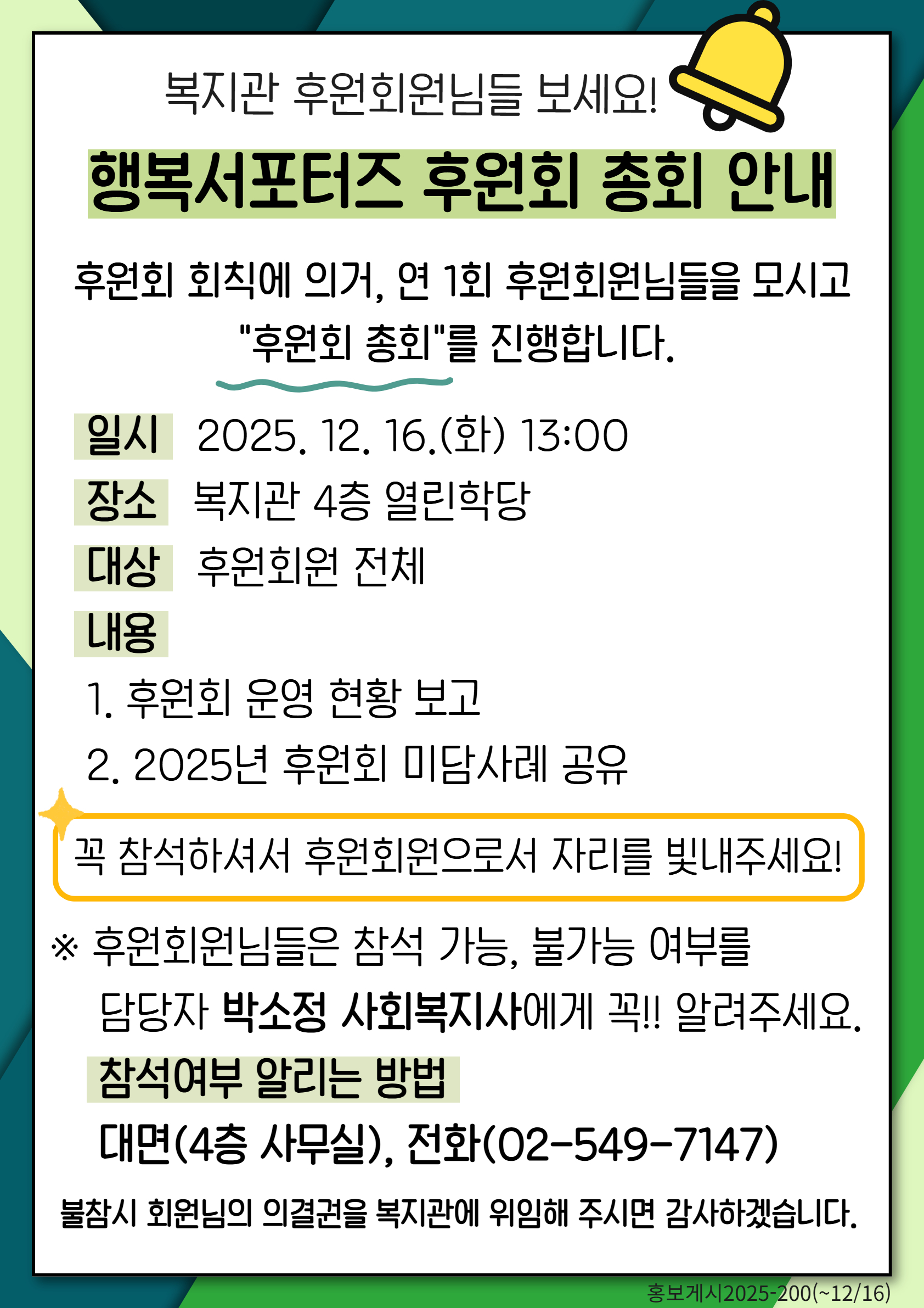 | 후원회 회칙에 의거, 연 1회 후원 회원님들을 모시고 "후원회 총회"를 진행합니다. 후원회 회원님들은 총회에 참석하시어 자리를 빛내주세요. |