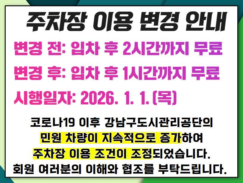 | 주차장 이용 여건 변화에 따라 주차장 무료 이용시간이 조정되어 안내드립니다. 2026년 1월 1일(목)부터는 주차권 없이 입차 후 1시간까지 무료로 운영되오니, 이용에 참고해주시기 바랍니다. |