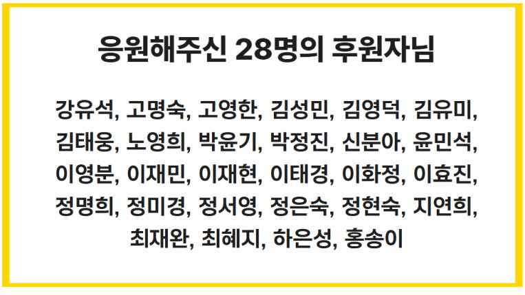 | 강남노인종합복지관 직원들은 '존중하고 섬기는 실천가', '겸손하고 유연한 전문가', '소통하고 연대하는 협력자'로서 지역사회 어르신들을 대상으로 최선의 복지서비스를 제공하기 위해 노력하고 있습니다. 그런 우리 직원들을 위해 기꺼이 후배들을 응원하는 마음을 담아 목적후원에 동참해주신 '후원자'님들을 소개합니다. |