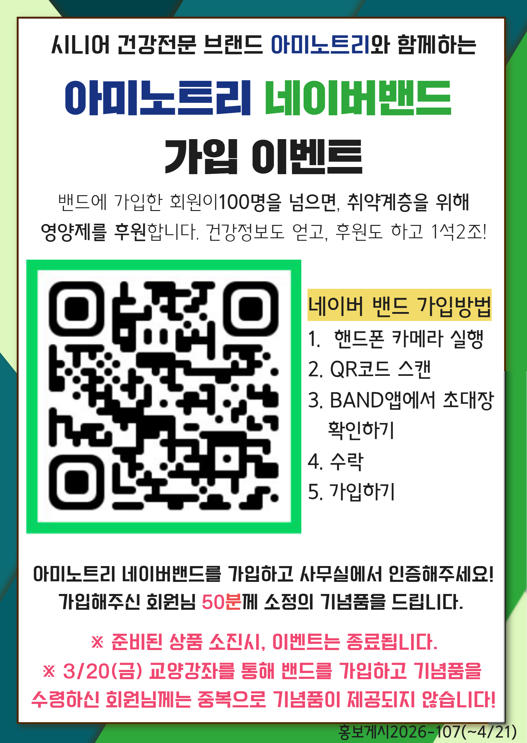 | 시니어 영양제 전문 브랜드 아미노트리 네이버 밴드가입을 통해, 건강정보도 얻고 취약계층도 지원하는 1석 2조 이벤트에 참여해주세요. 아미노트리 네이버밴드 가입후, 사무실에서 인증해 주시면 소정의 기념품을 드립니다. |