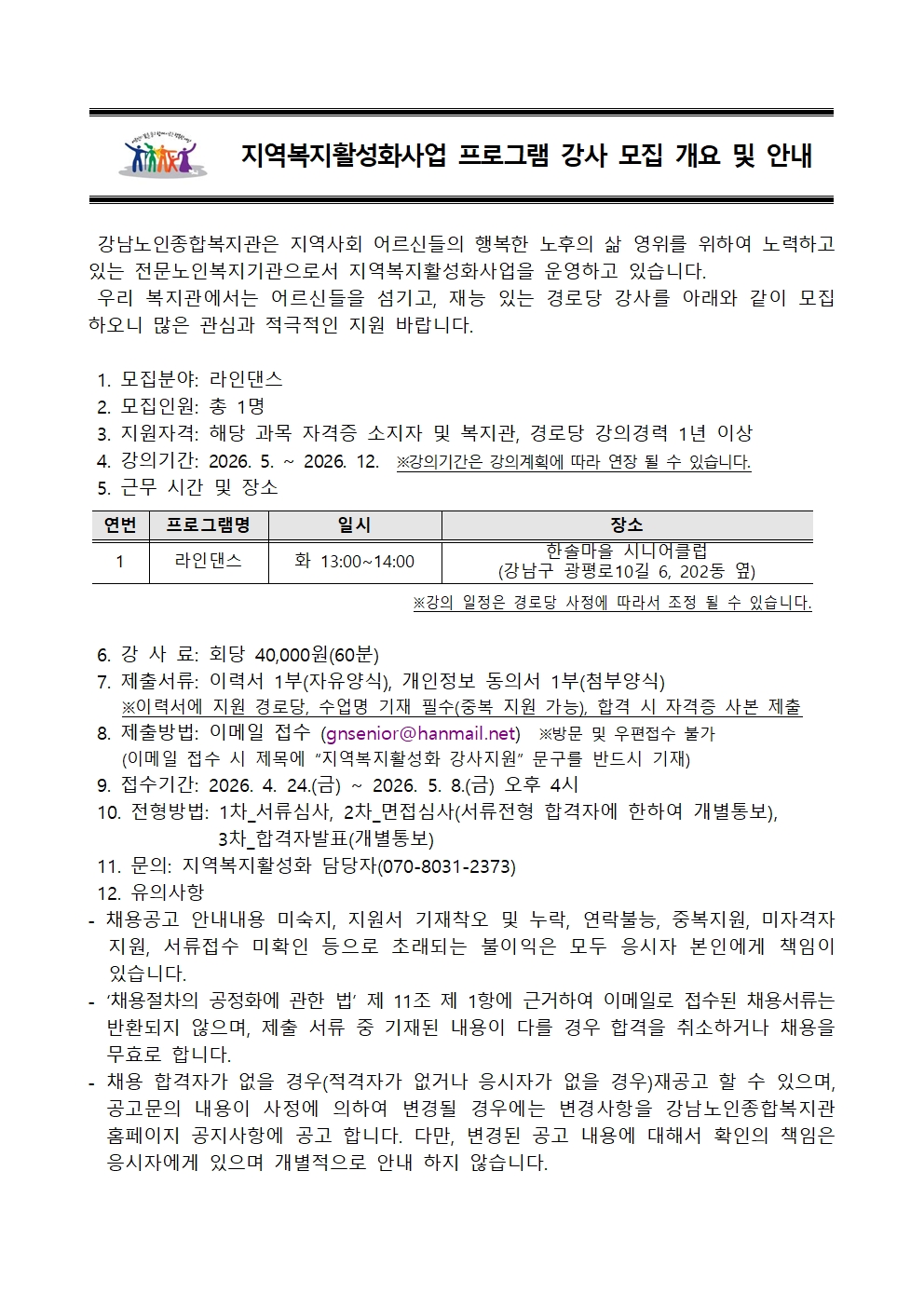 [지역복지활성화사업] 경로당 프로그램 강사 모집 공고