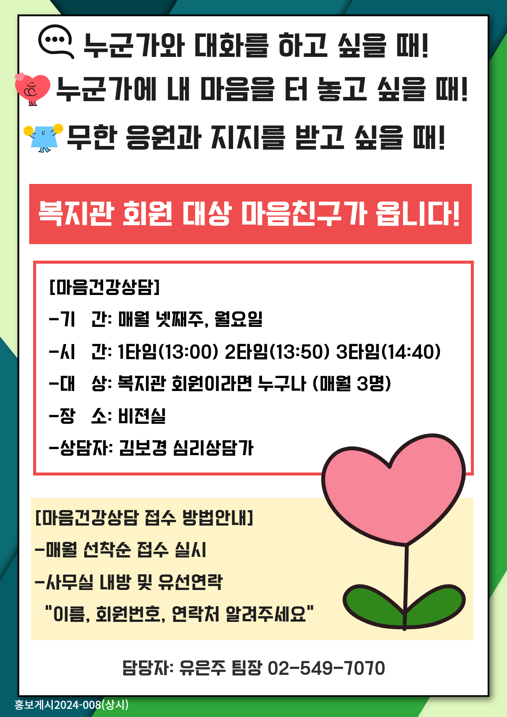※접수는 전화 혹은 내방하시어 이름+회원번호+전화번호+상담주제를 알려주세요!
