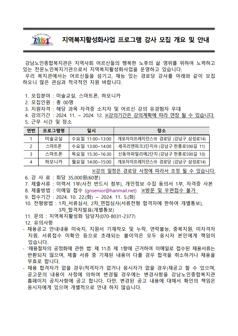 [지역복지활성화사업]경로당 프로그램 강사 모집 공고