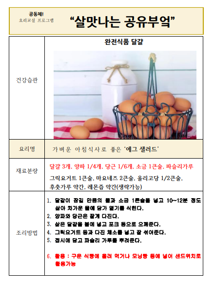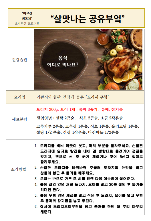 | 70+특화사업 '살맛나는 공유부엌' 프로그램은 노년기 만성질환을 가진 경로당 회원의 건강한 식습관 형성을 위한 공동체 요리 프로그램입니다. 2기수 래미안도곡카운티 경로당 회원들은 총 7가지 (오이 무침, 두부 포케, 도라지 무침, 크래미 샐러드와 통밀 샌드위치, 도토리묵 무침, 에그 샐러드와 통밀 샌드위치, 반숙 간장 계란장) 요리실습과 회기별 영양건강습관 교육에 참여했습니다. |
