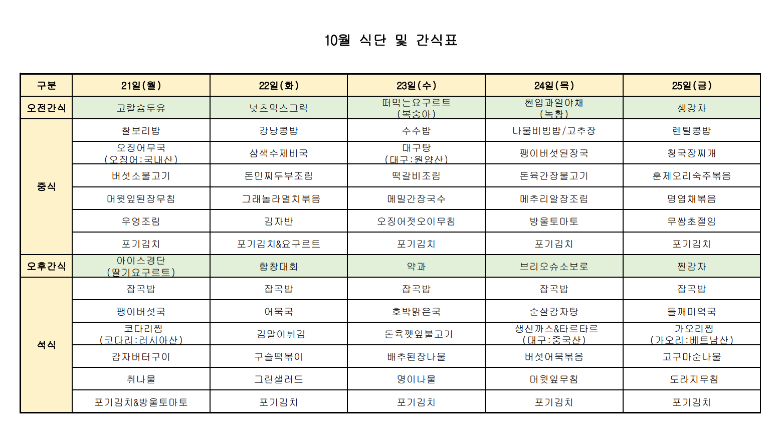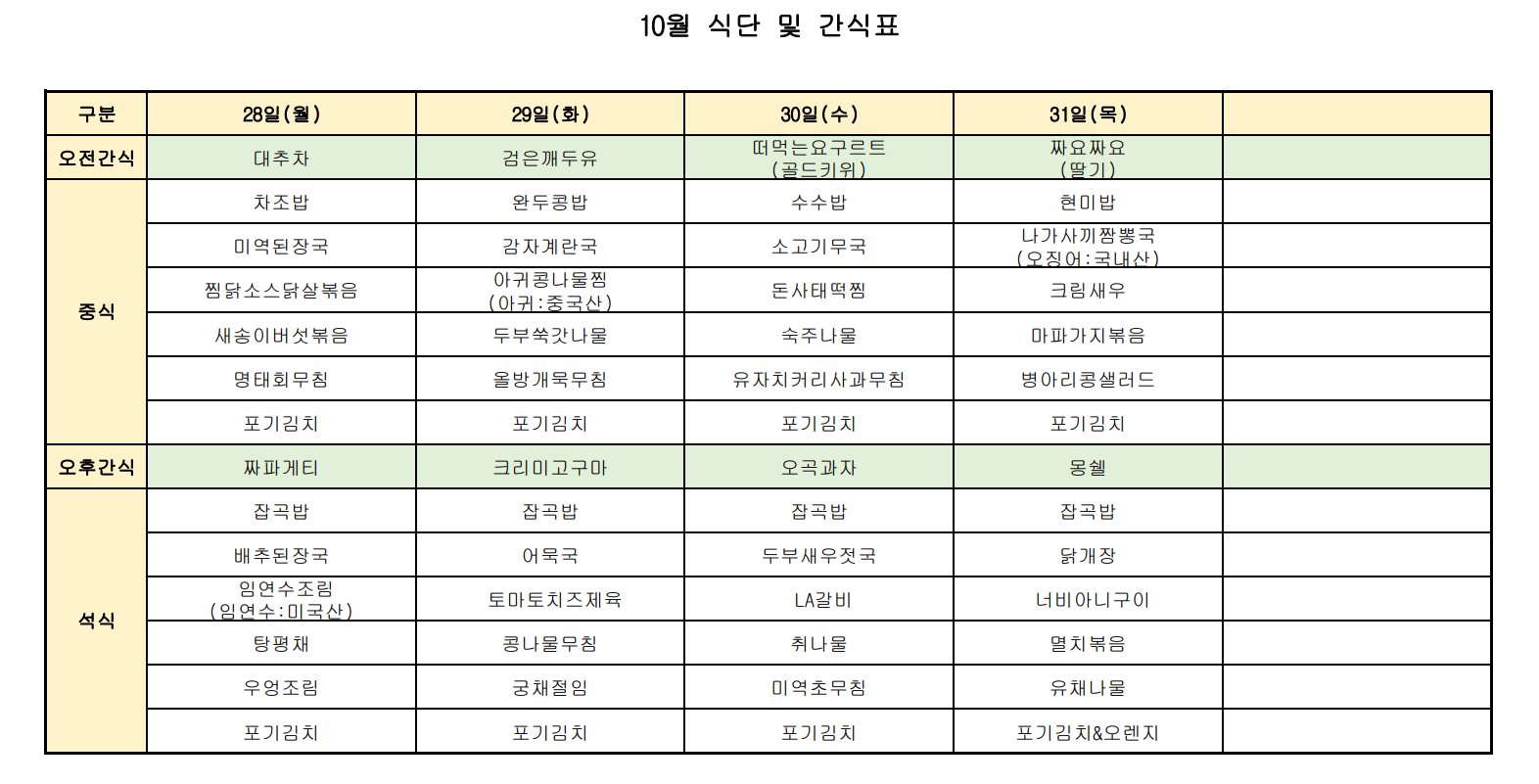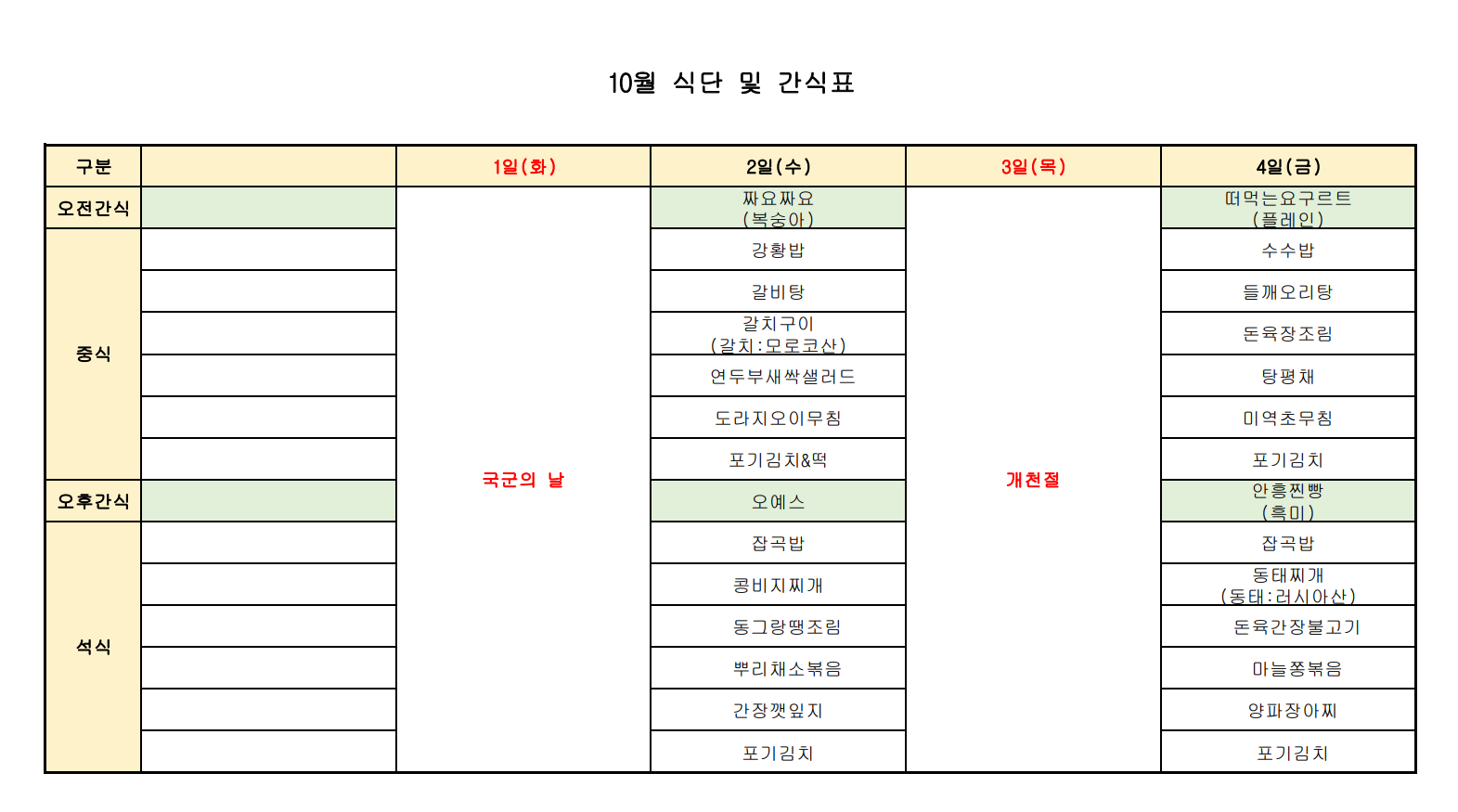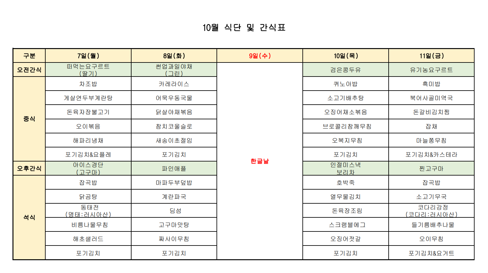 [강남데이케어센터] 2024년 10월 식단 및 간식표