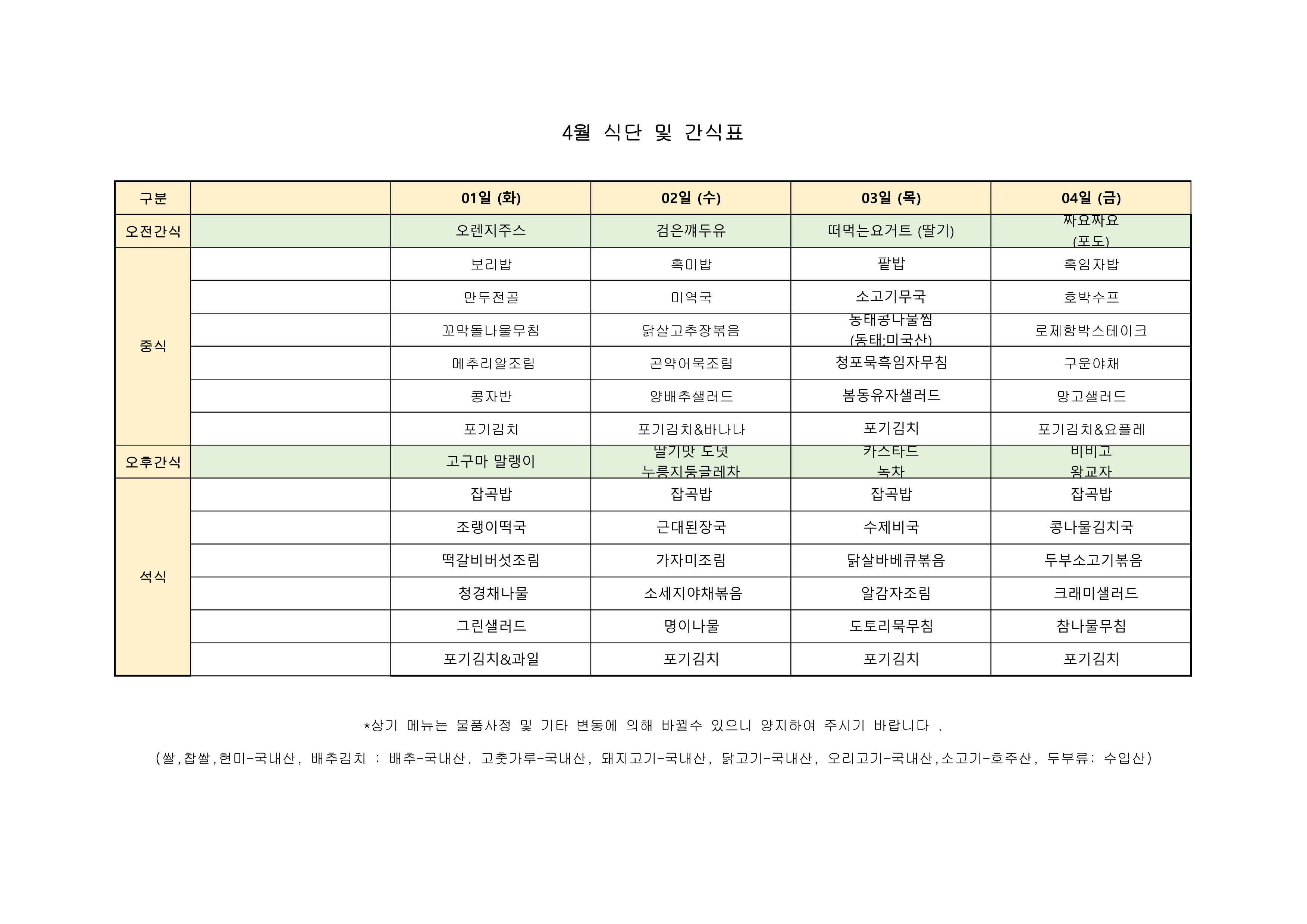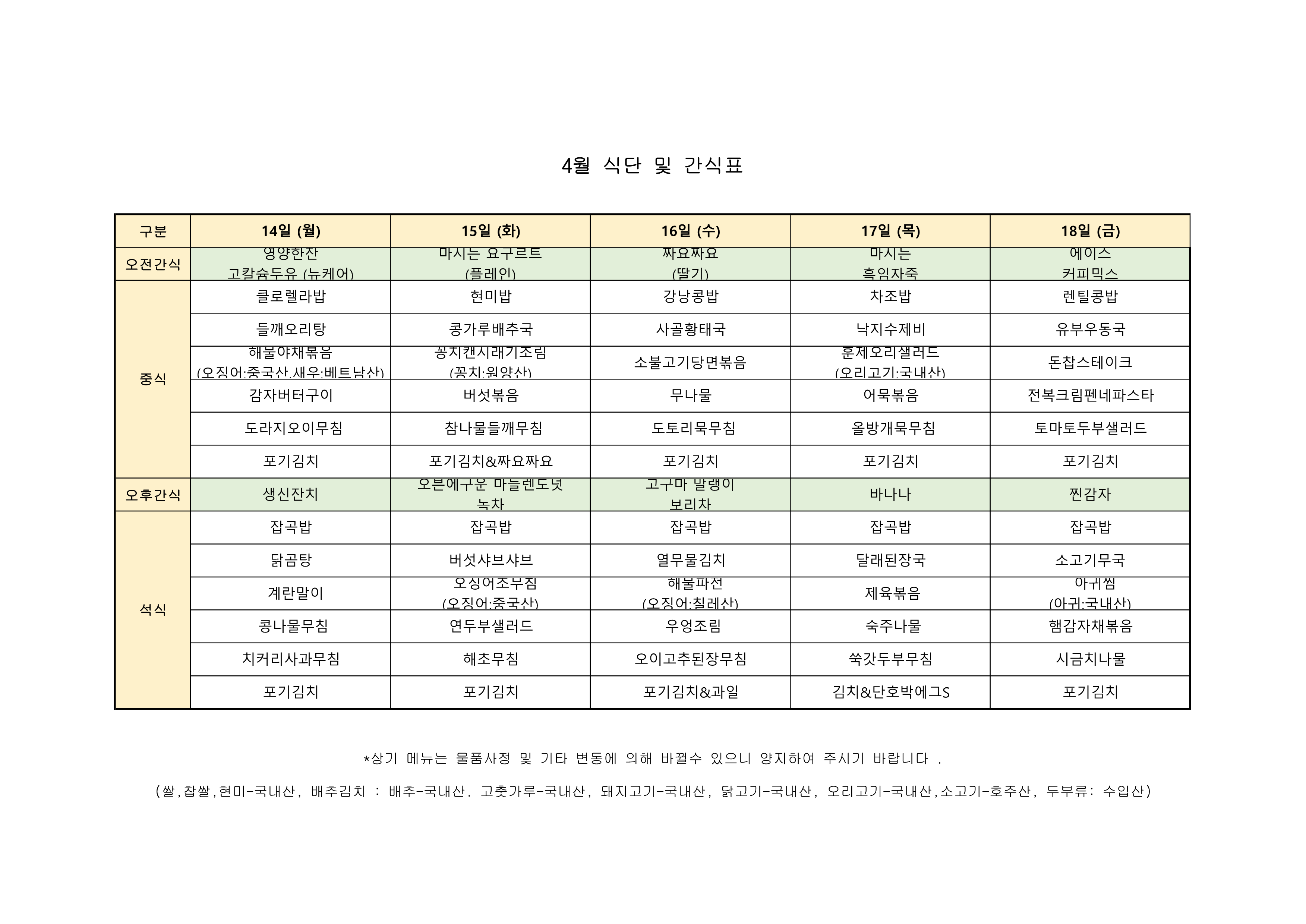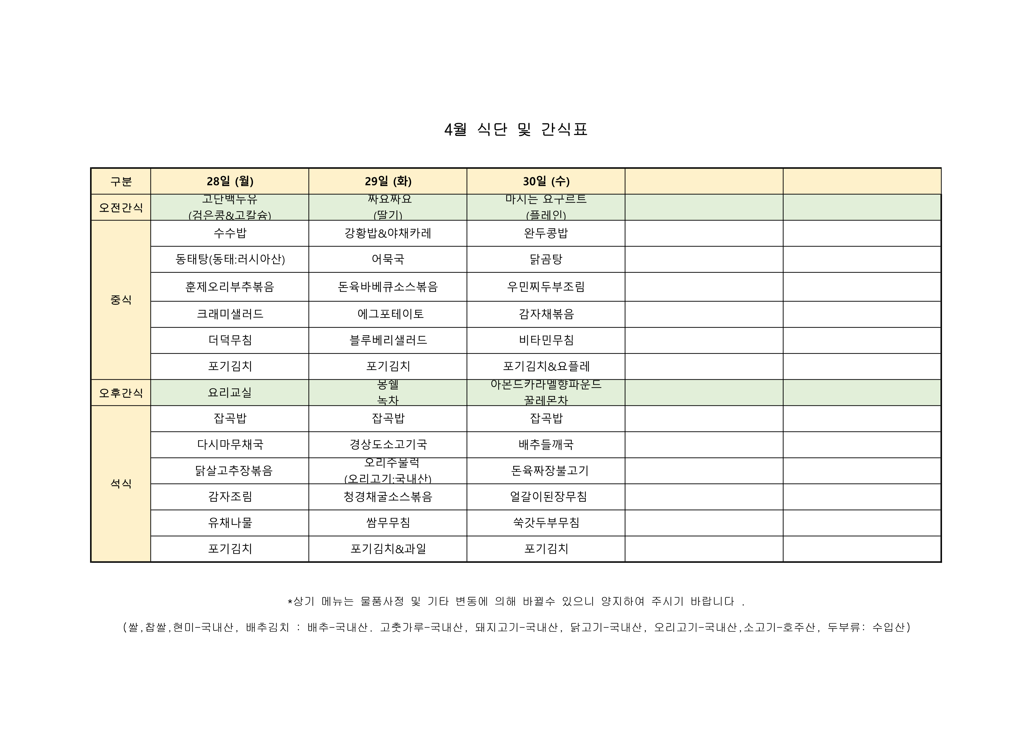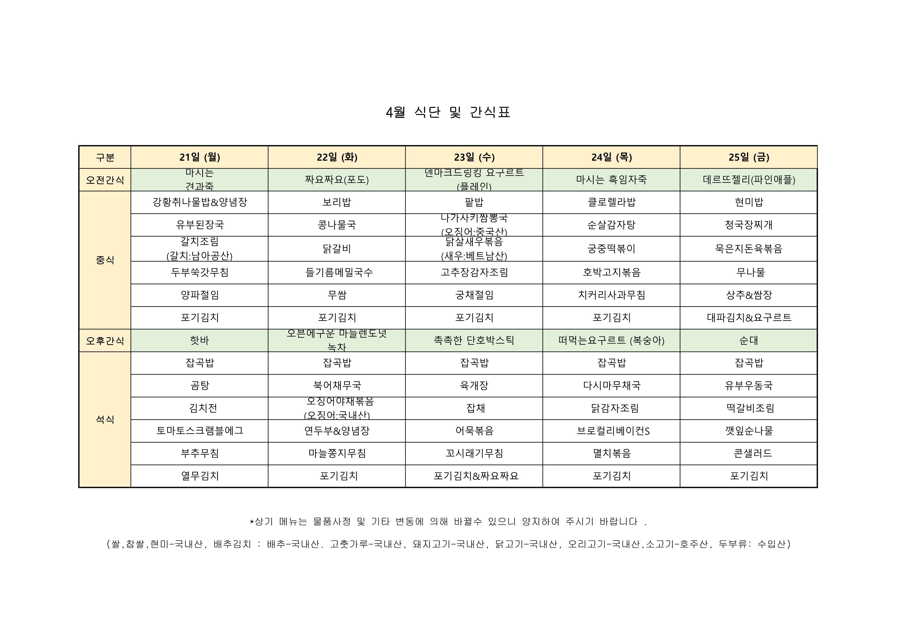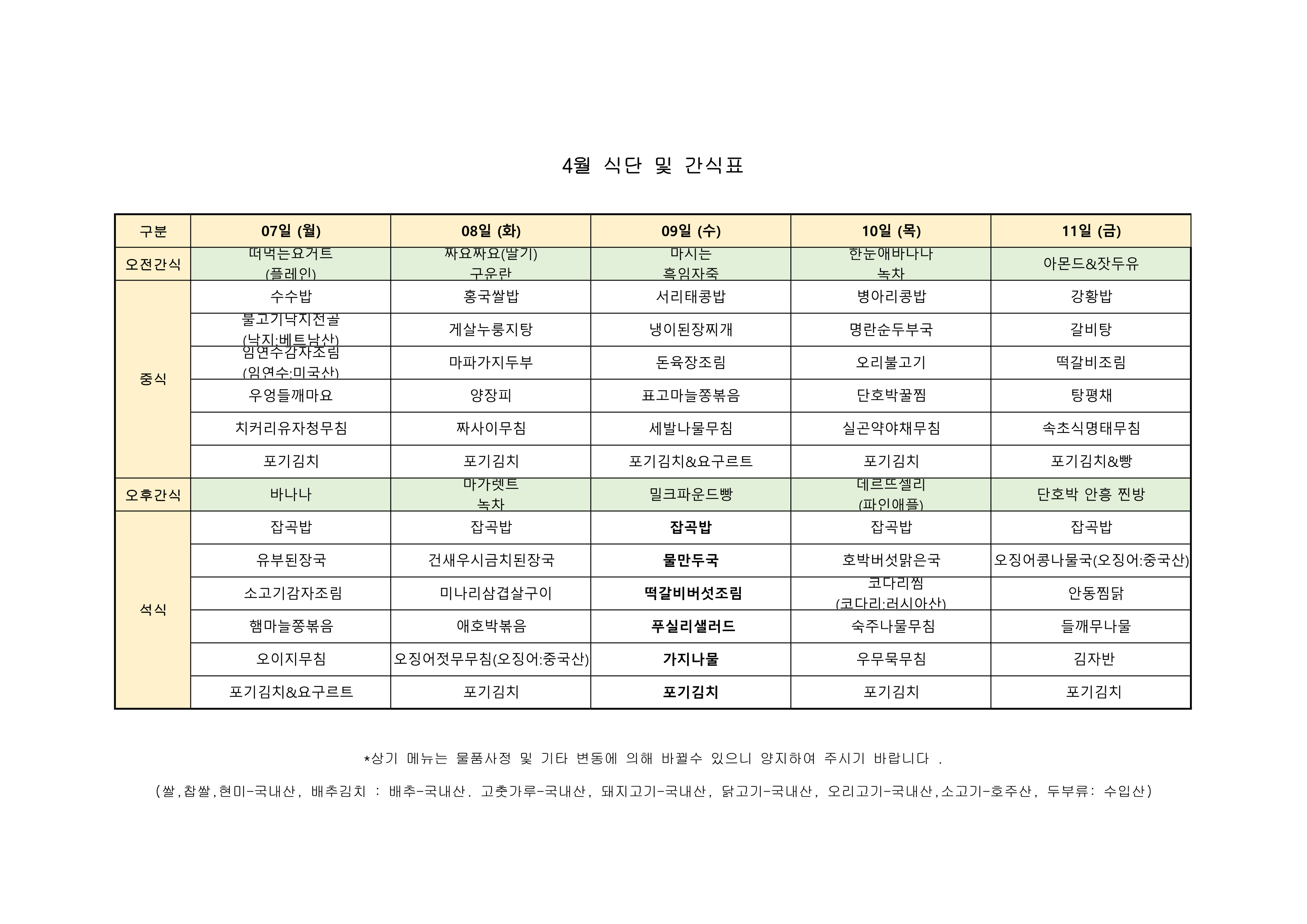 [강남데이케어센터] 2025년 4월 식단 및 간식표