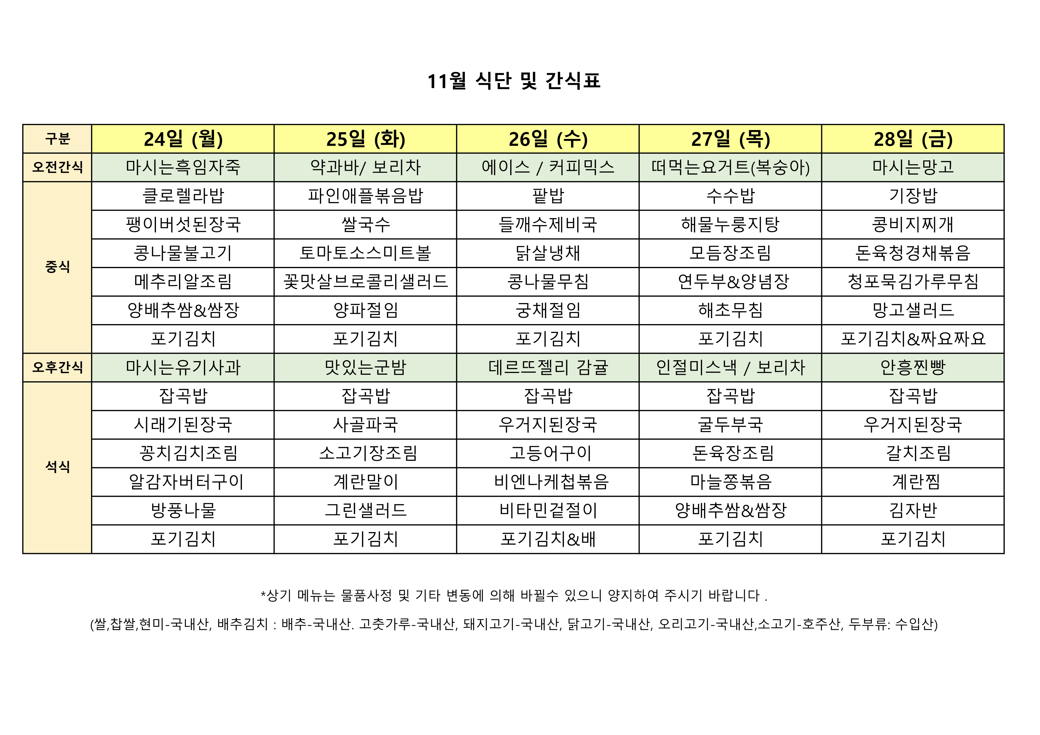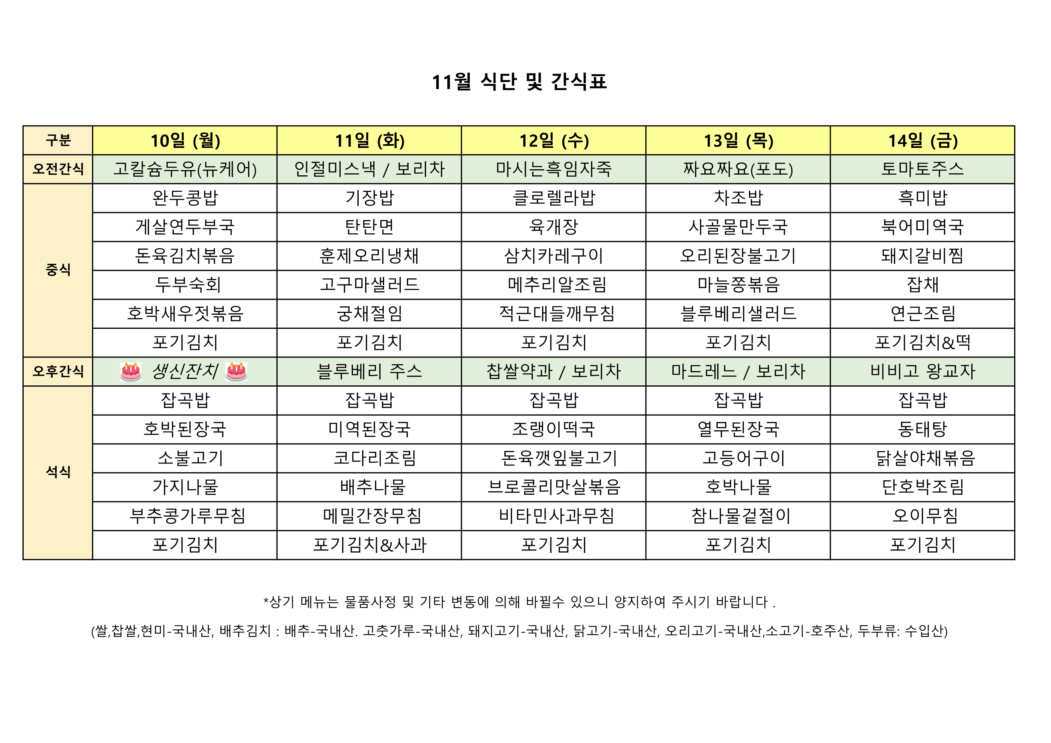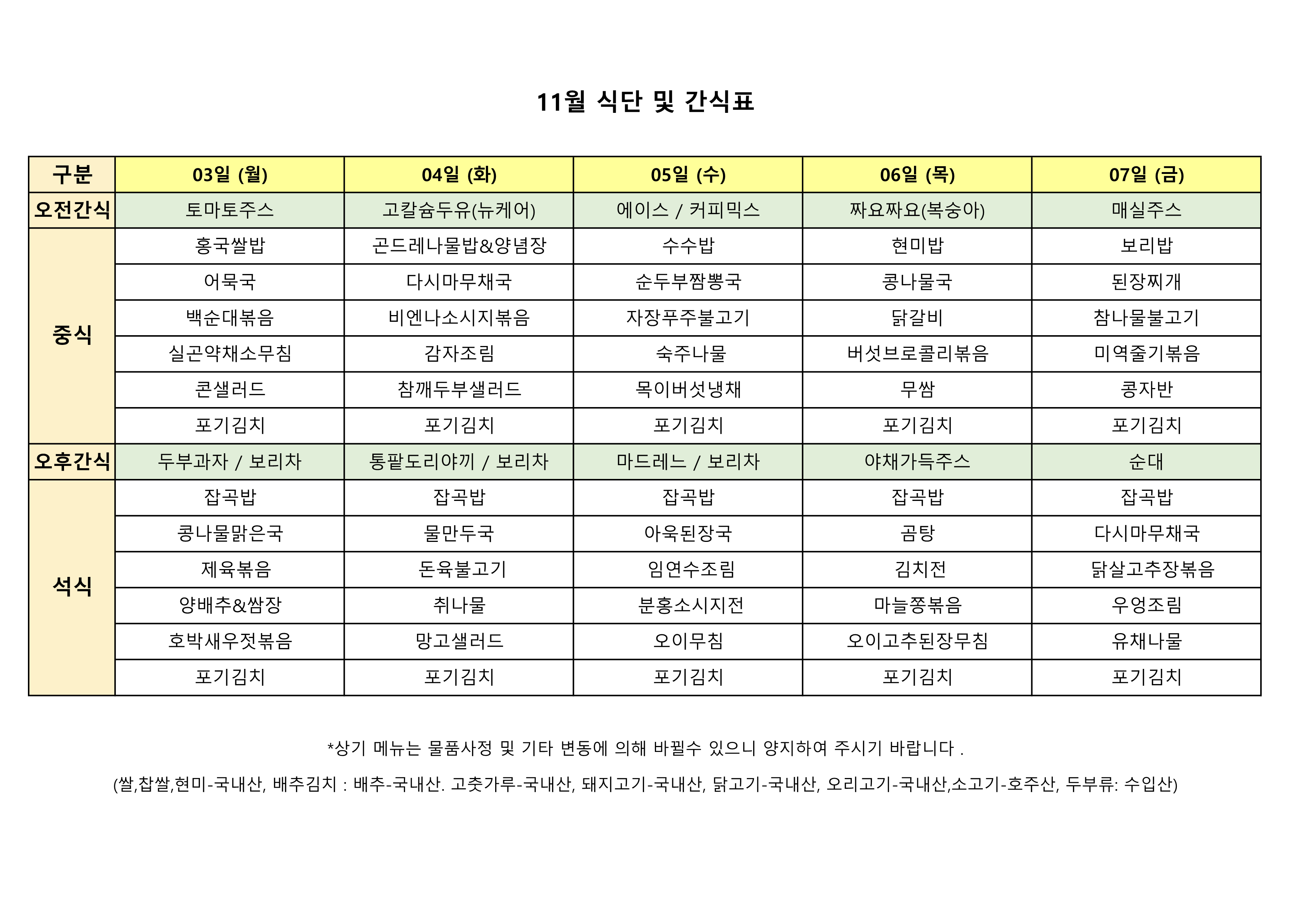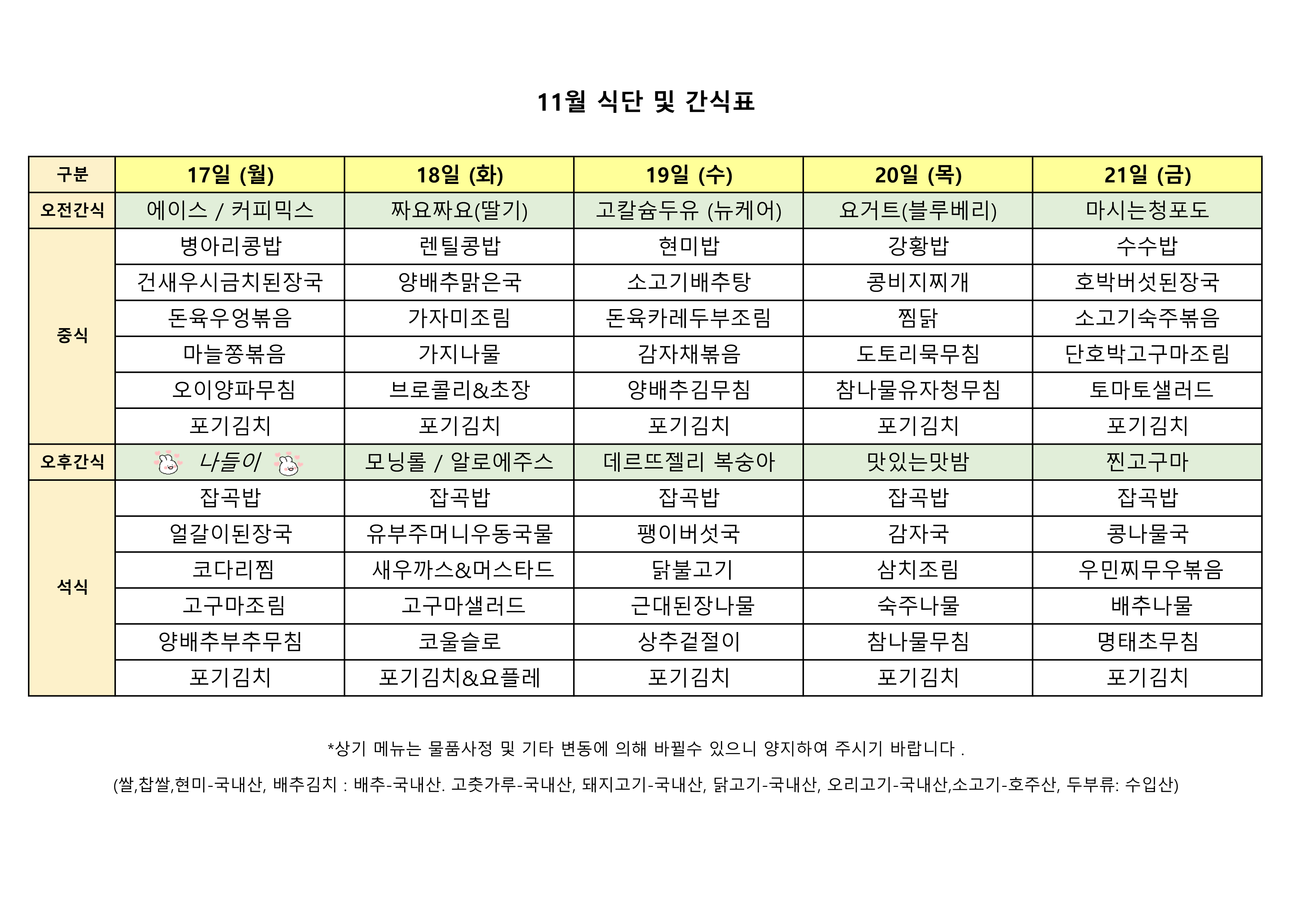 [강남데이케어센터] 2025년 11월 식단 및 간식표