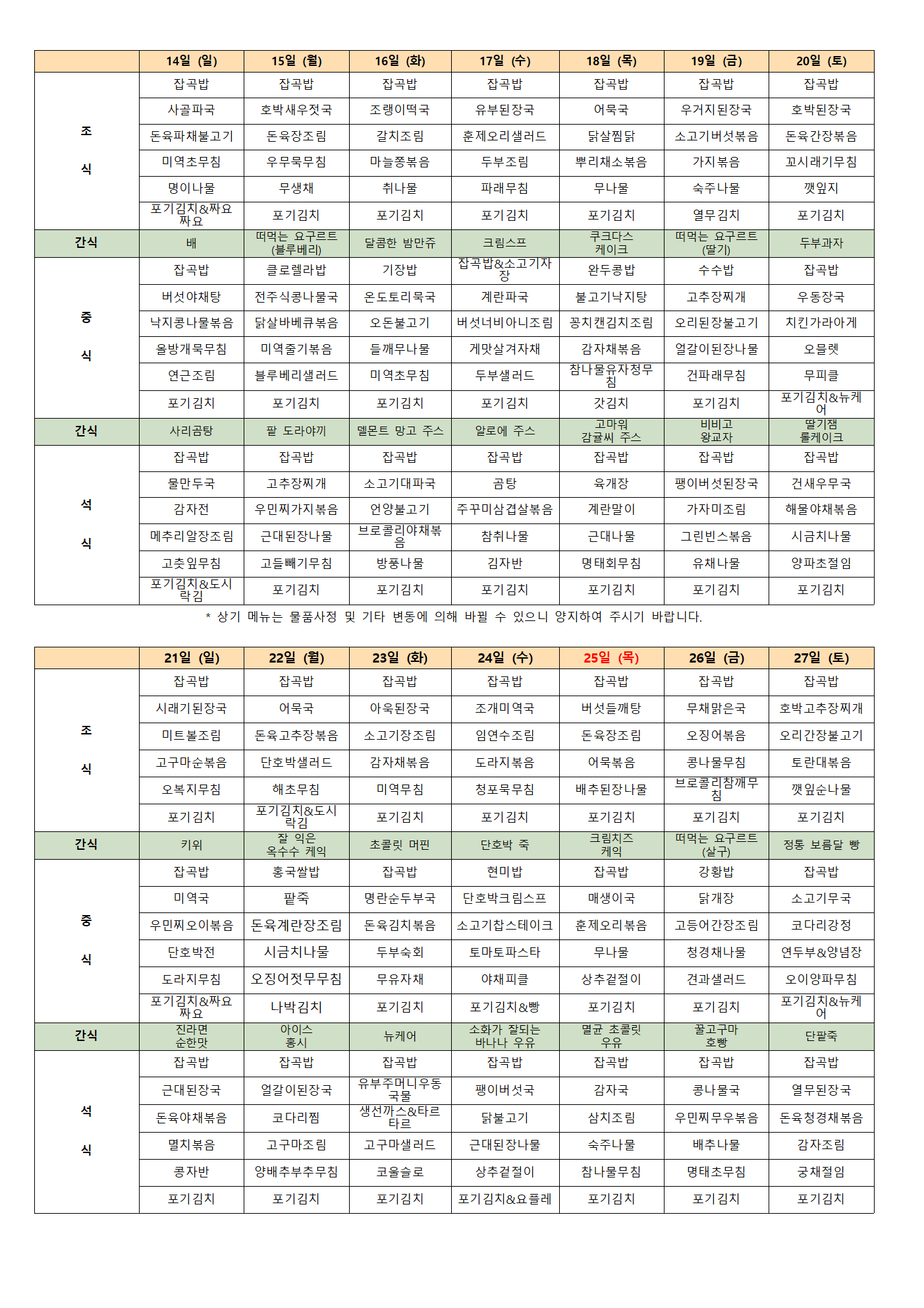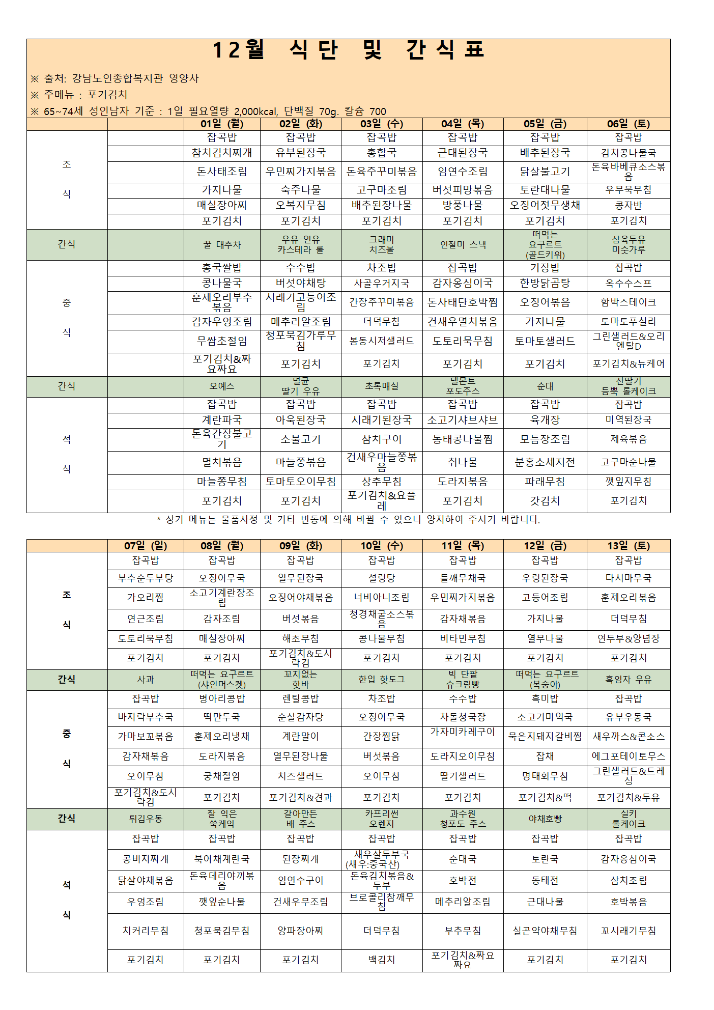 [강남실버센터] 2025년 12월 식단표 및 간식표