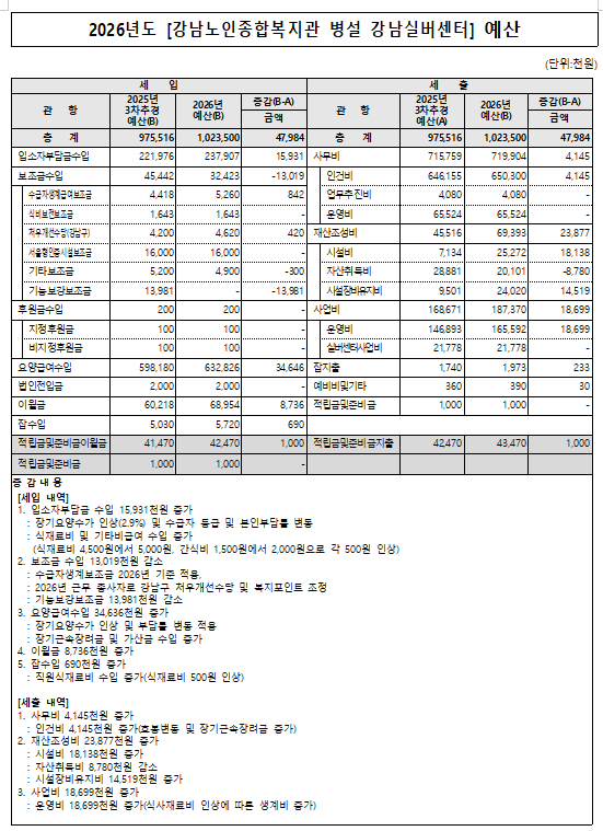 강남실버센터 2026년 예산을 다음과 같이 공고합니다.