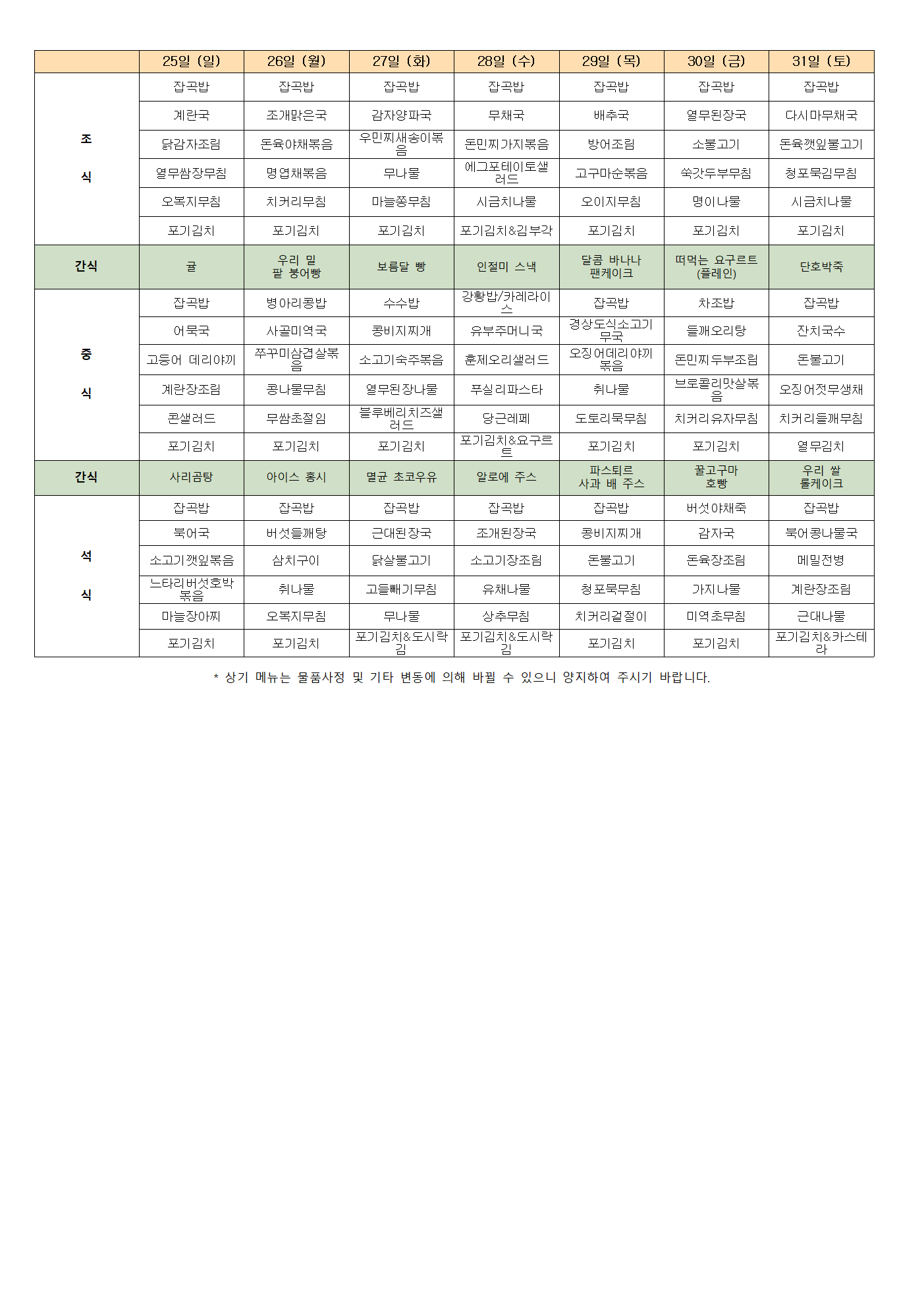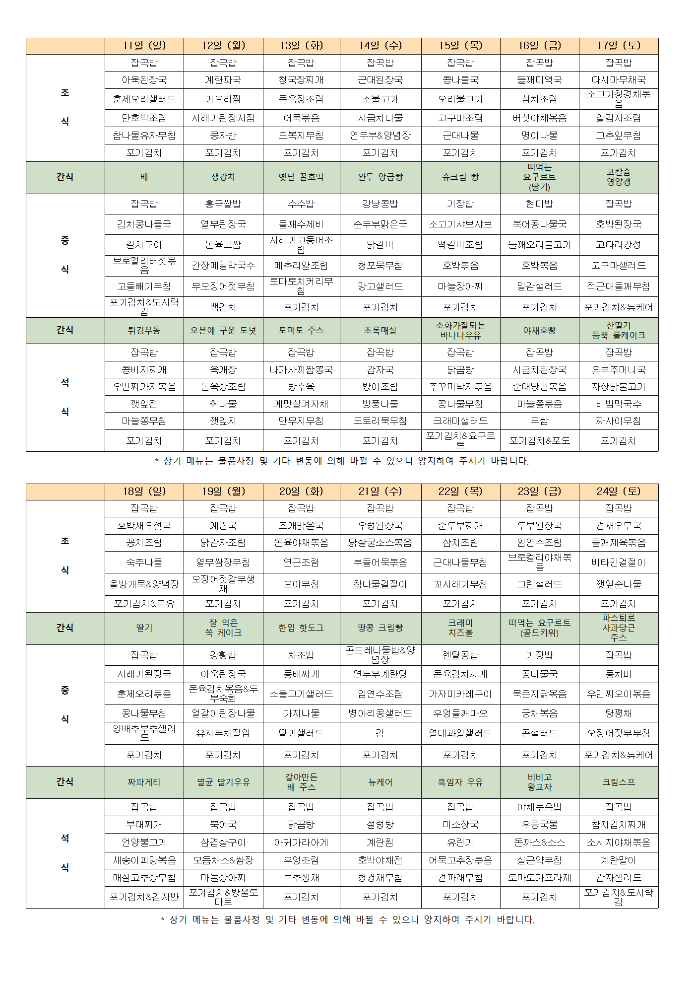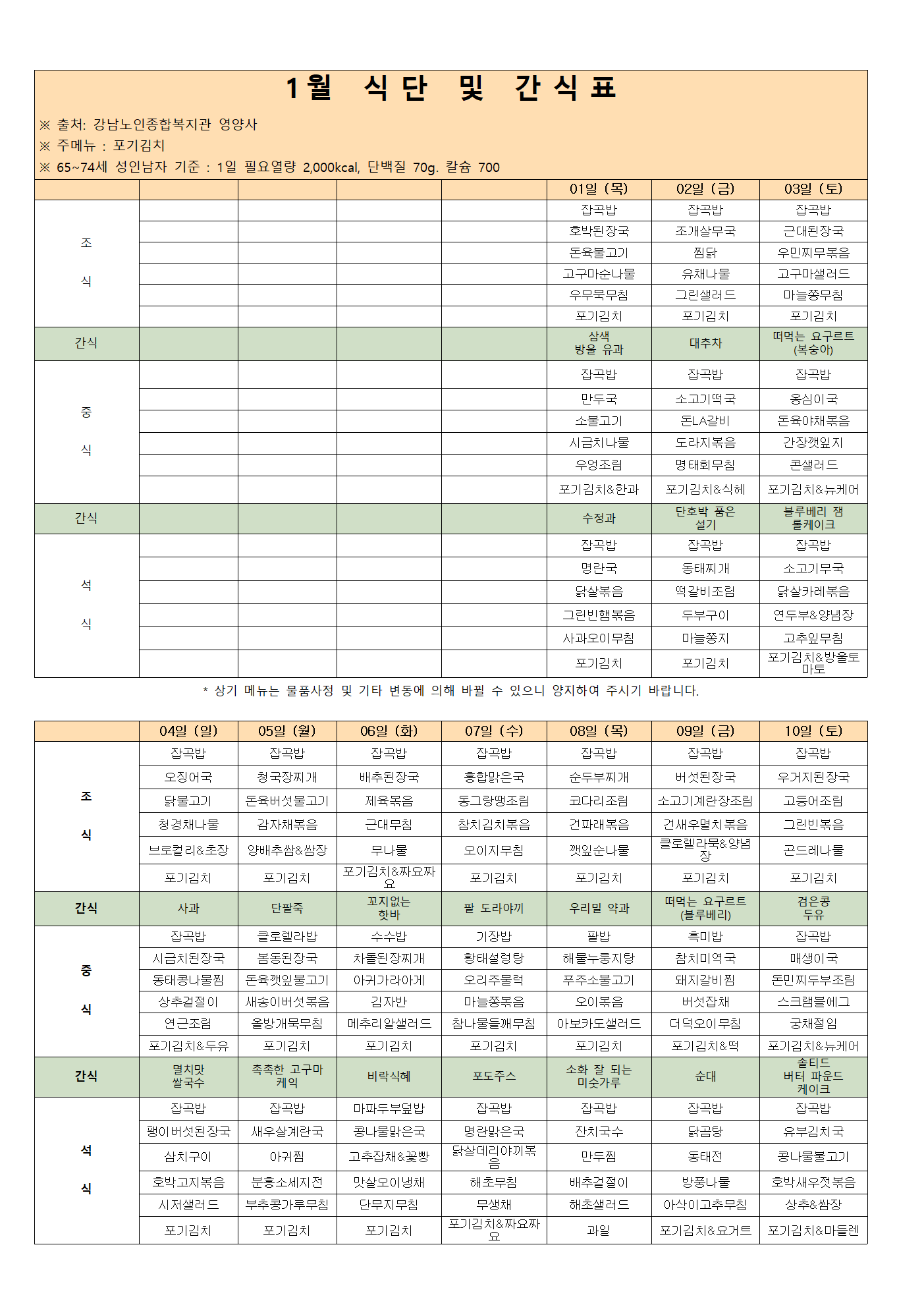 [강남실버센터] 2026년 1월 식단표 및 간식표