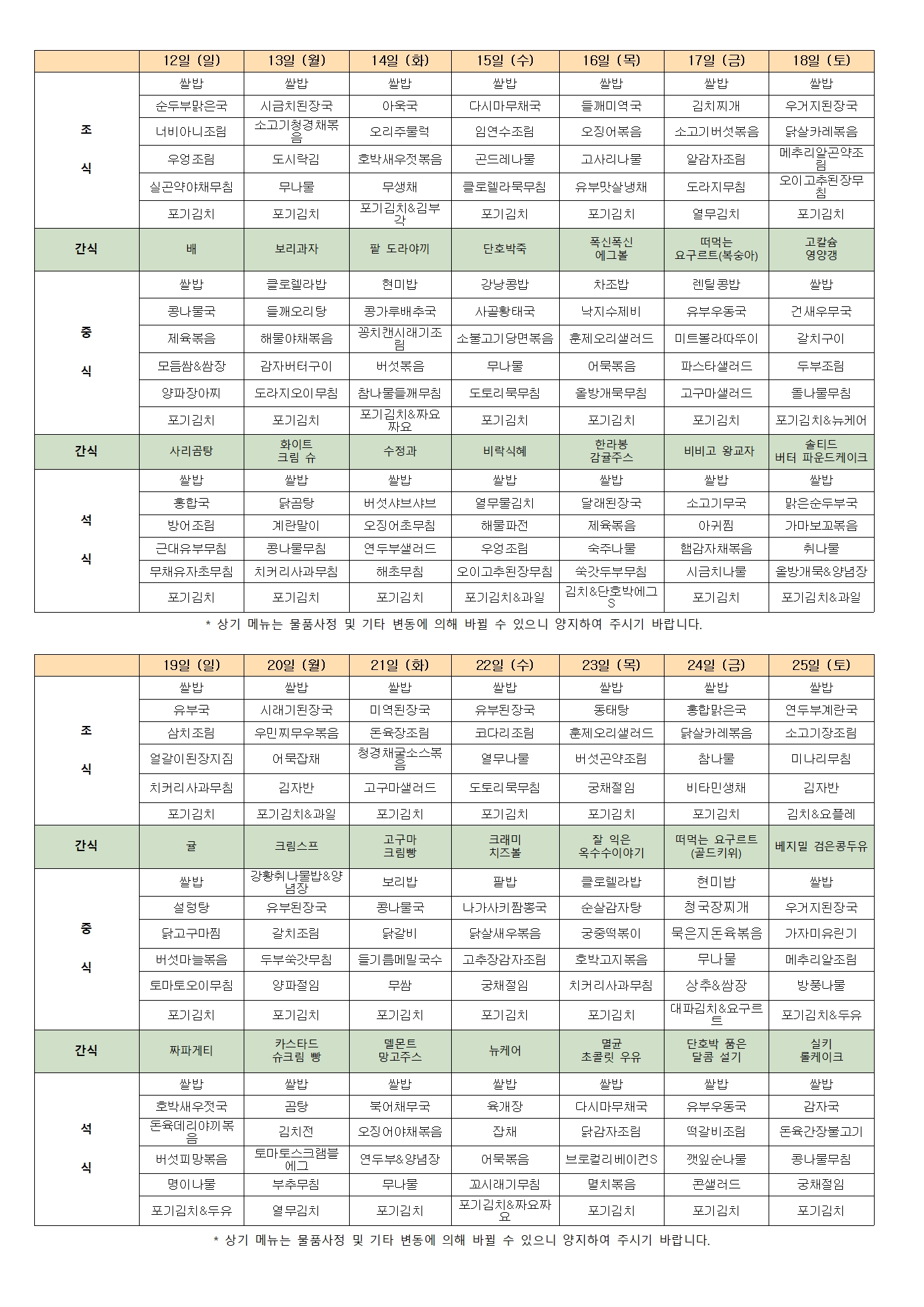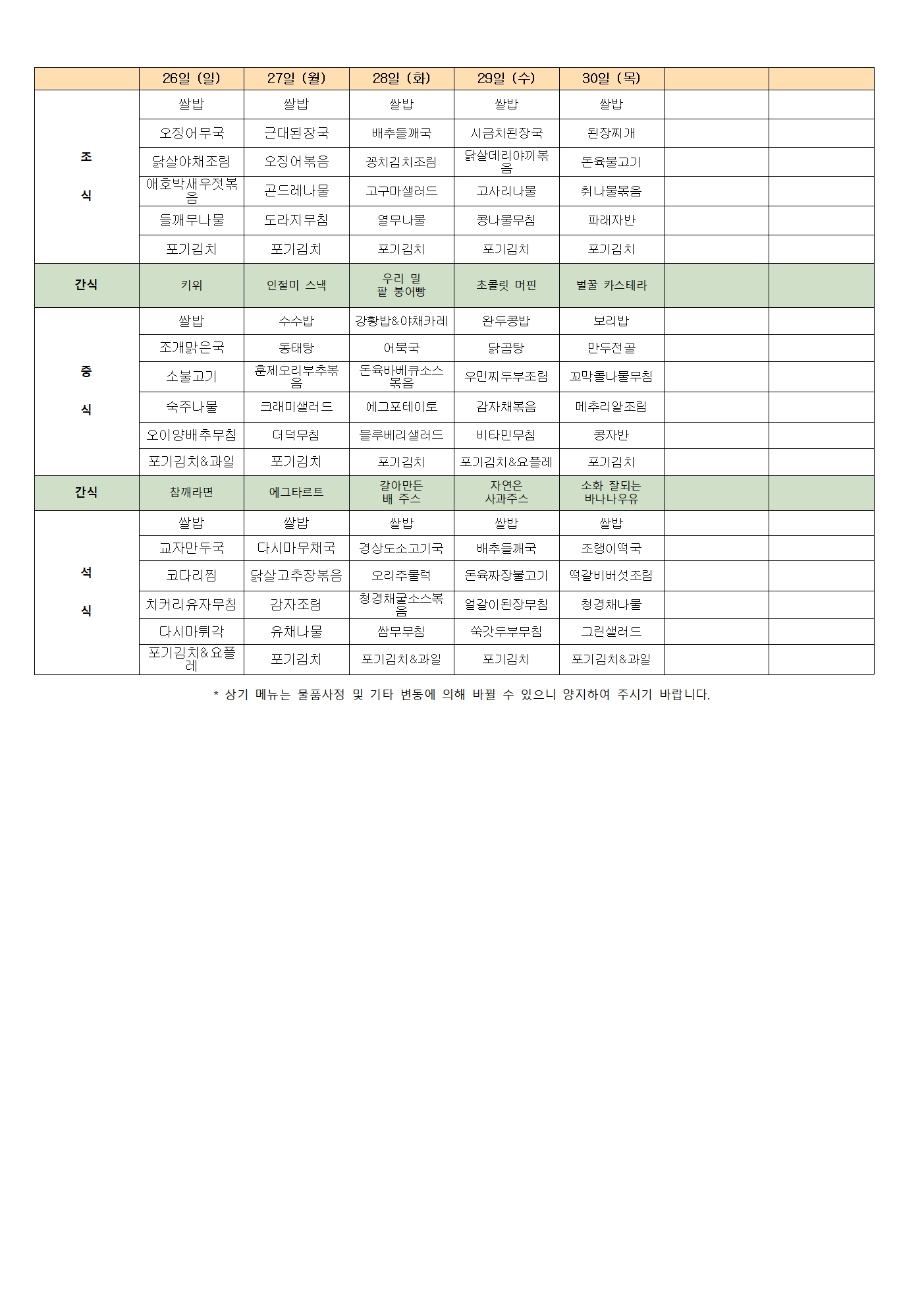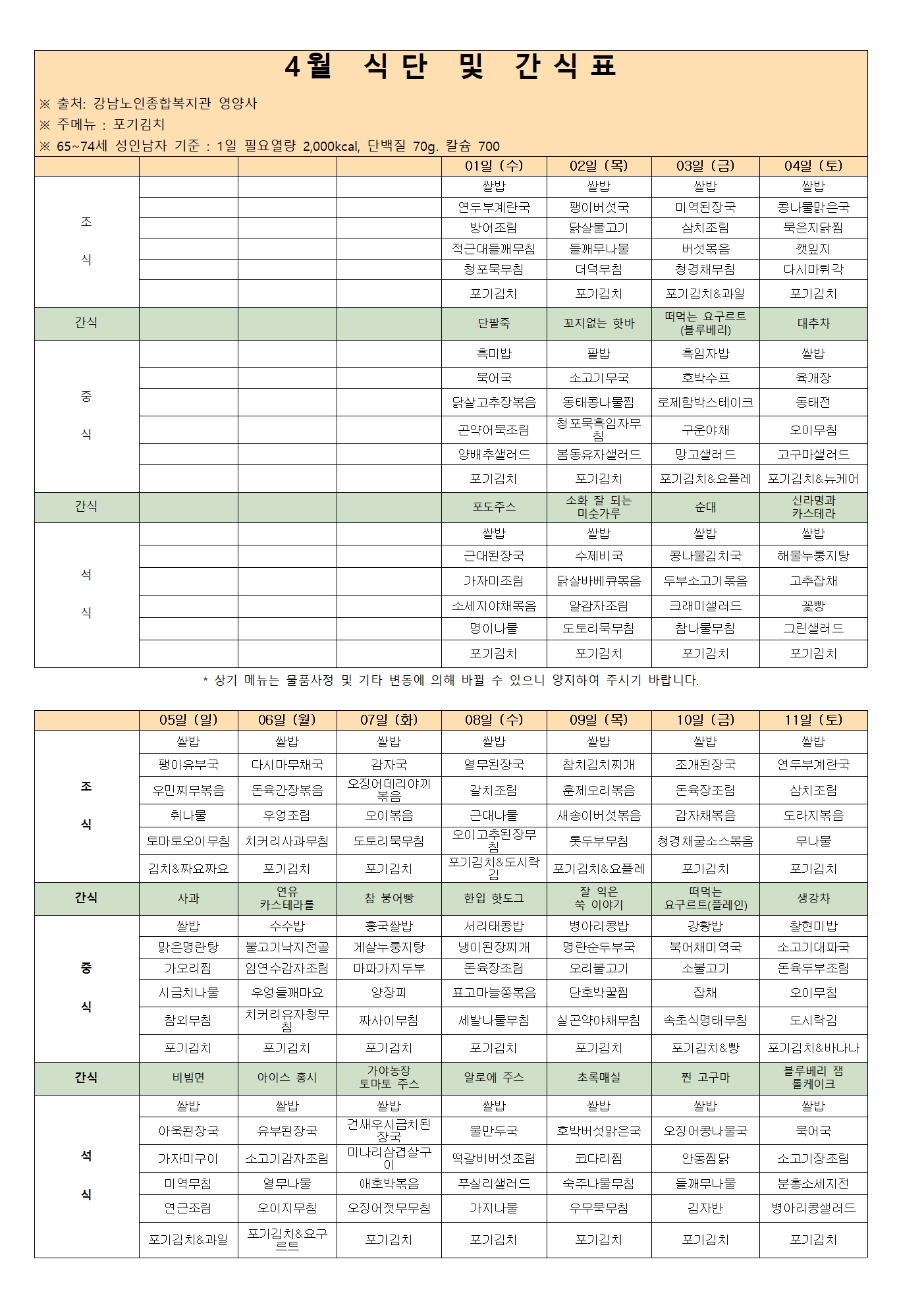 [강남실버센터] 2026년 4월 식단표 및 간식표