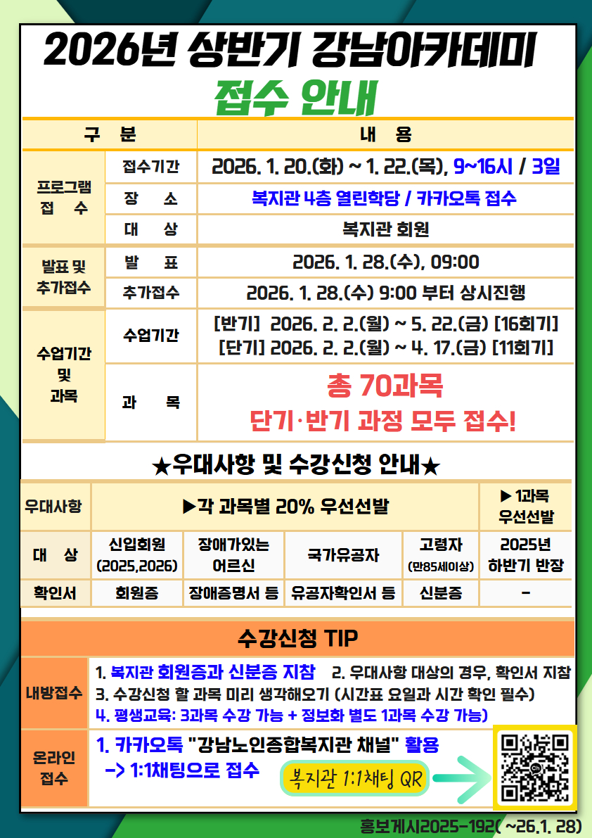 - [평생교육] 2026년 상반기 강남아카데미 프로그램 접수 안내 2025-12-08