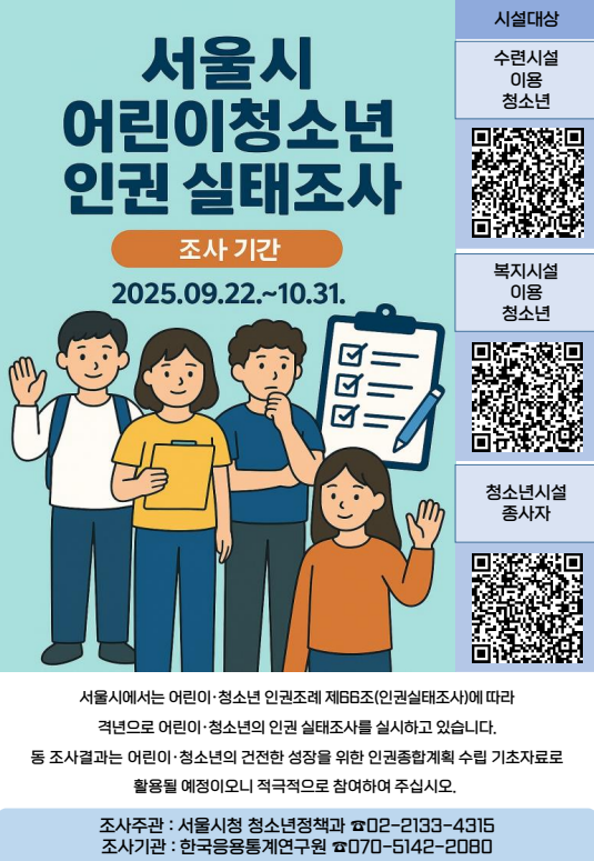 조사기간은 2025.09.22(월)~10.31(금)까지이며, 조사결과는 어린이・청소년의 건전한 성장을 위한 인권종합계획 수립 기초자료로 활용될 예정이오니 적극적으로 참여부탁드립니다.