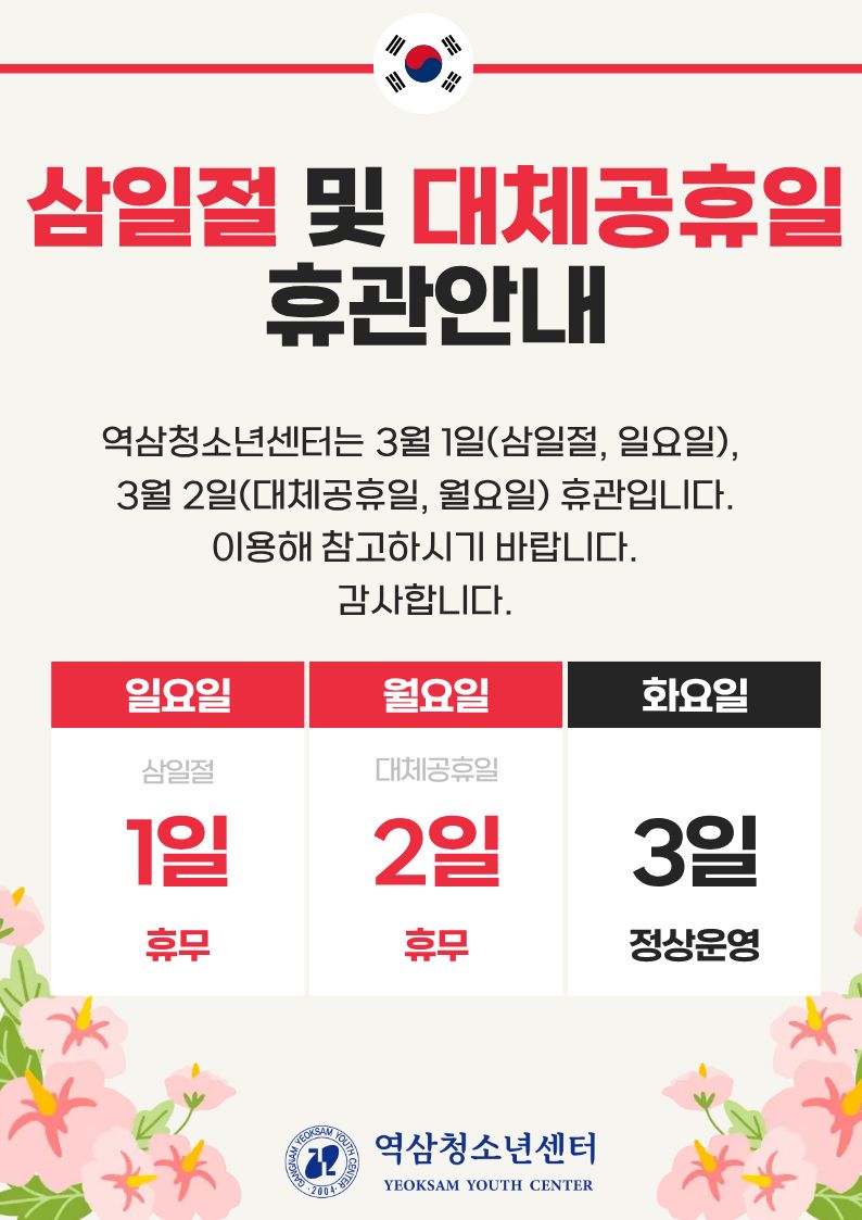 2026년 역삼청소년센터 삼일절, 대체공휴일 휴관 안내