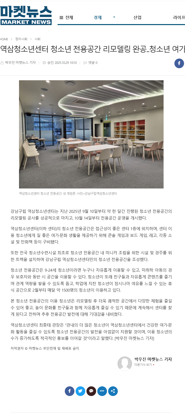 역삼청소년센터 청소년 전용공간 리모델링 완공