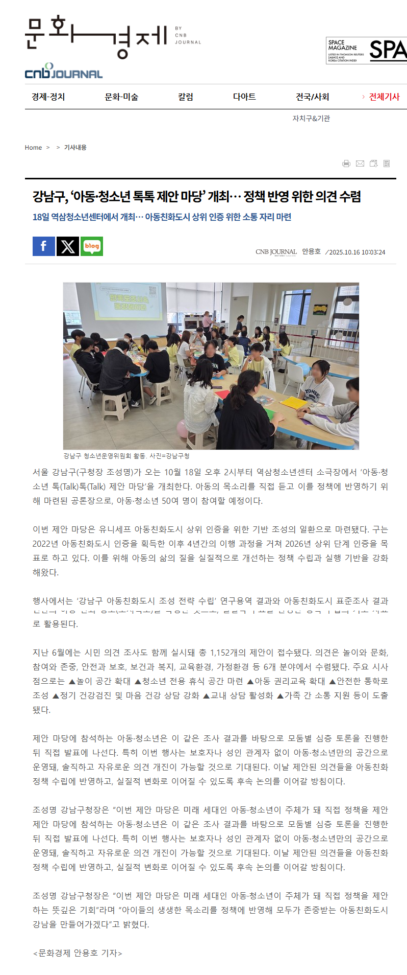 강남구, 아동청소년 톡톡 제안 마당 개최... 정책 반영 위한 의견 수립