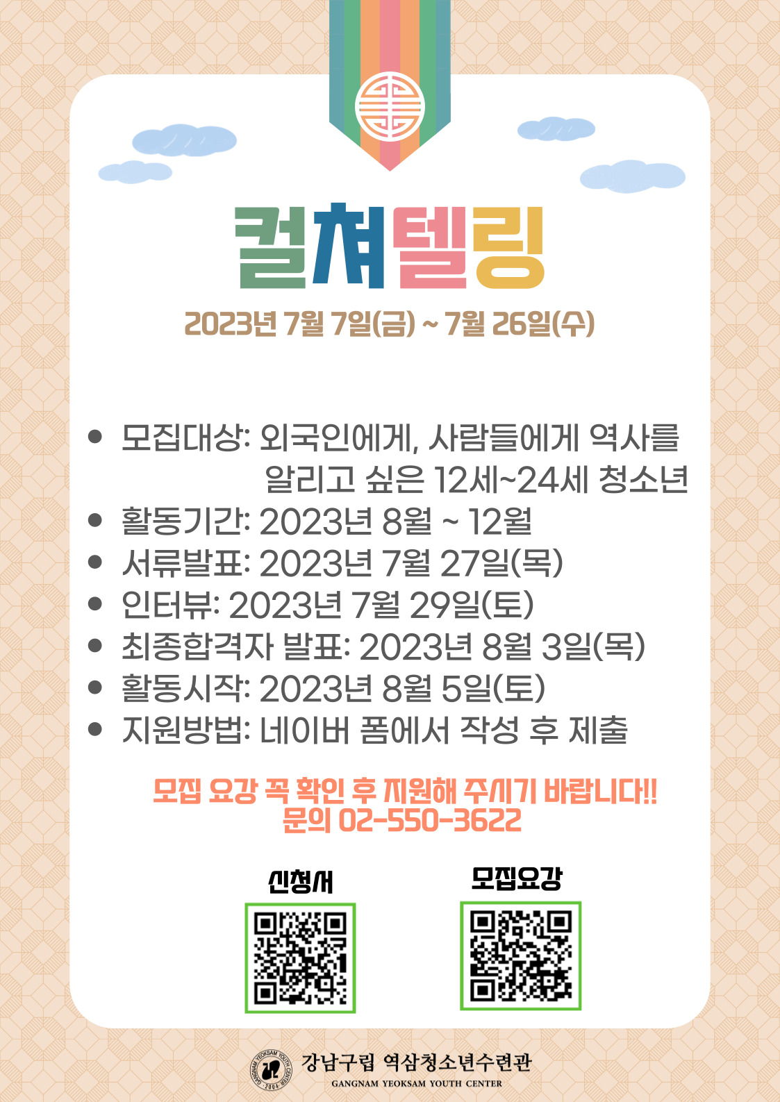 ★ 자세한 내용은 아래 첨부파일 '2023년 역삼청소년수련 청소년 자치조직 컬쳐텔링동아리 모집요강'에 자세하게 나와있으니 꼭 확인해주시기 바랍니다.