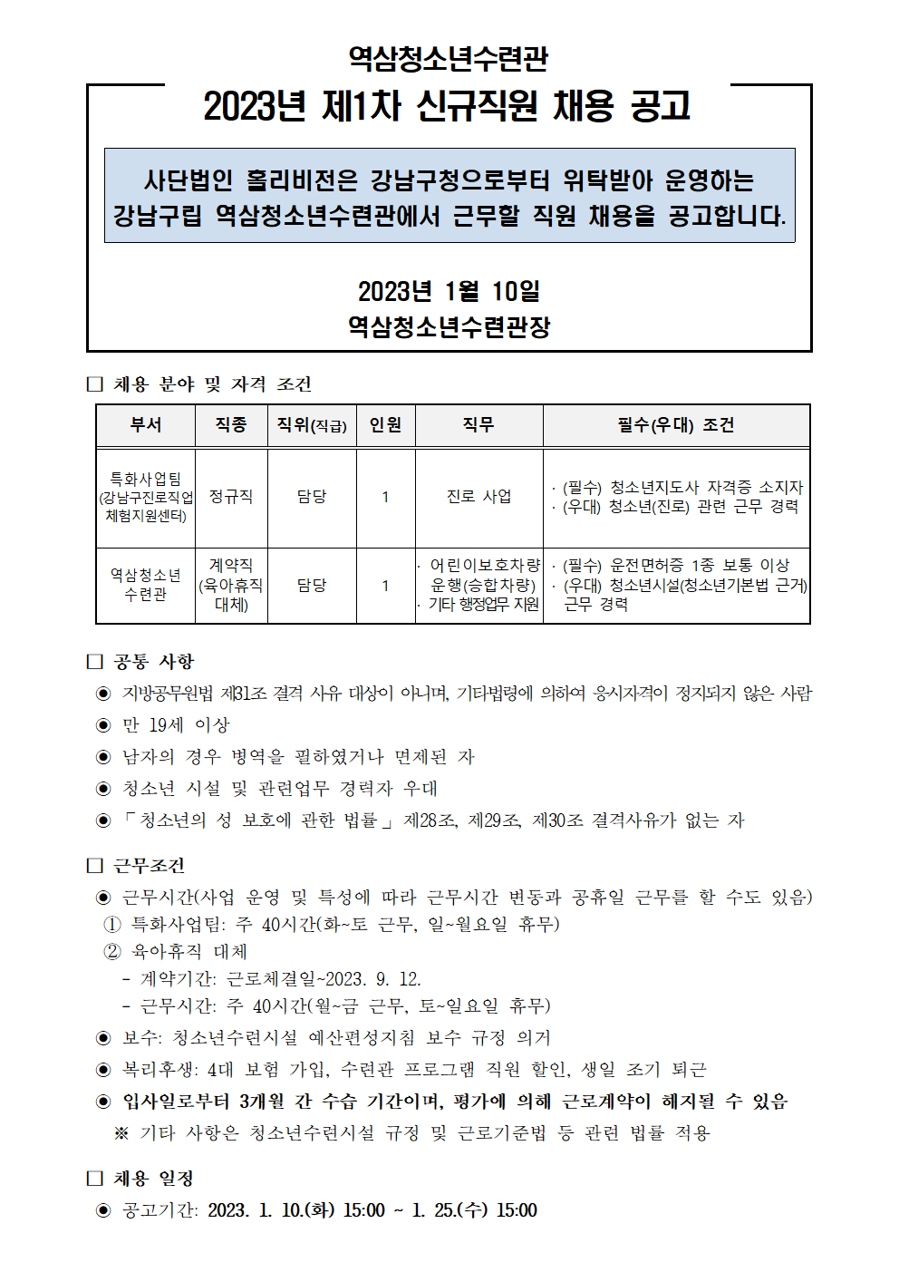 1. 2023년 제1차 역삼청소년수련관 신규직원 채용 공고문.hwp