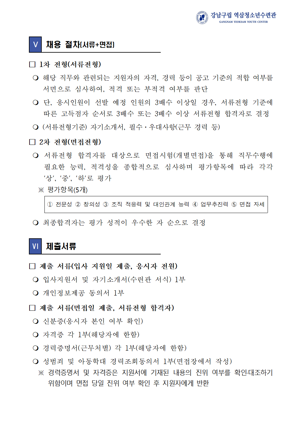 2023년 제6차 역삼청소년수련관 신규직원 채용 서류전형 결과 및 면접 일정 안내
