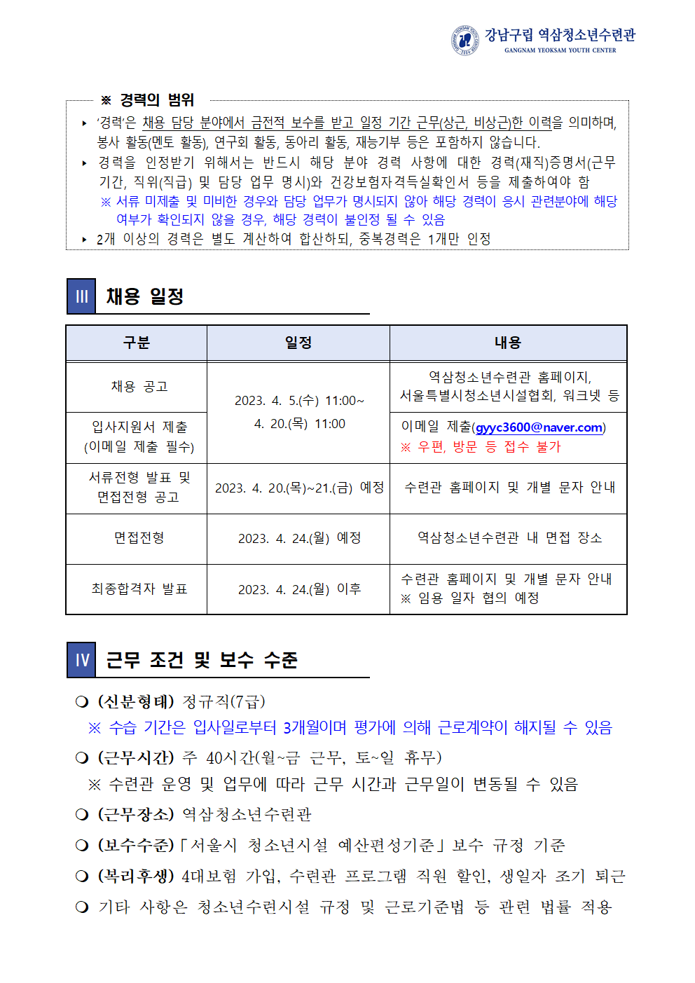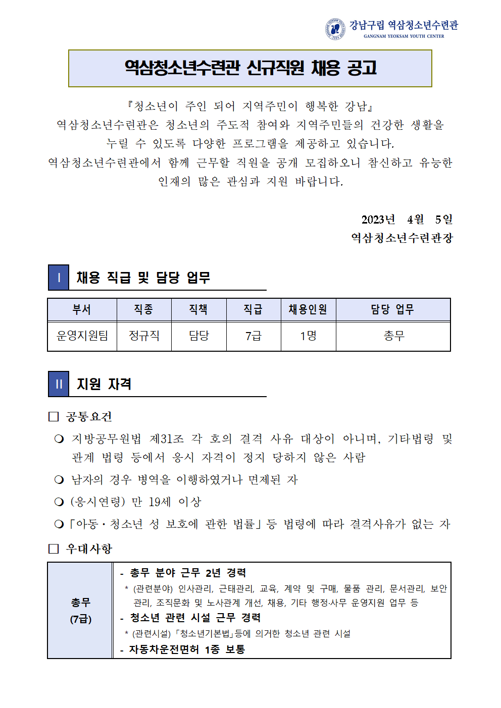 2023년도 제5차 역삼청소년수련관 신규 직원 채용 공고