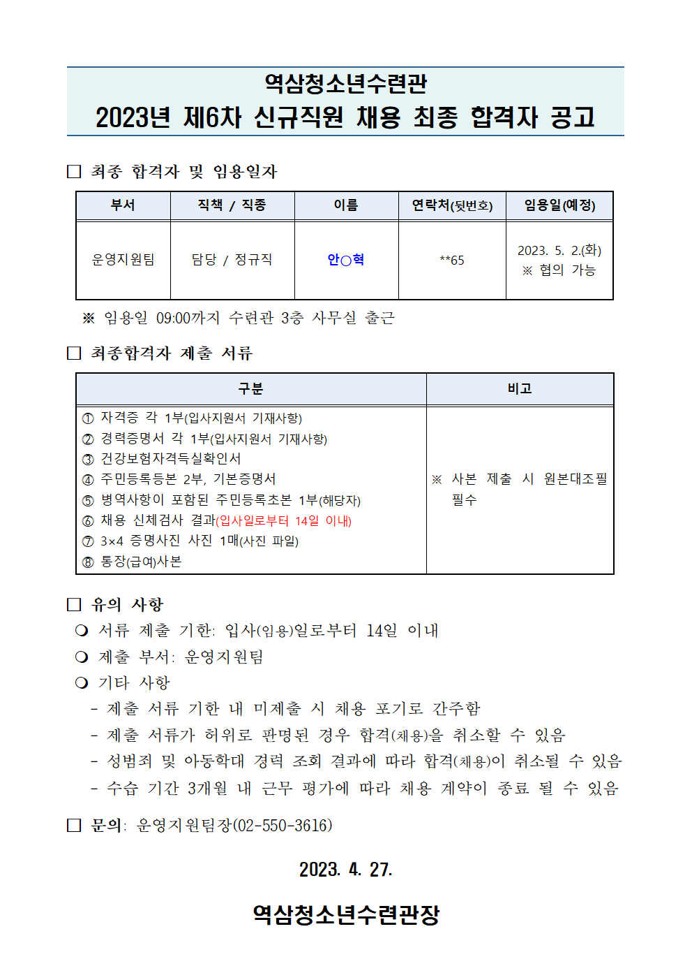 2023년 제6차 역삼청소년수련관 신규직원 채용 최종합격자 공고