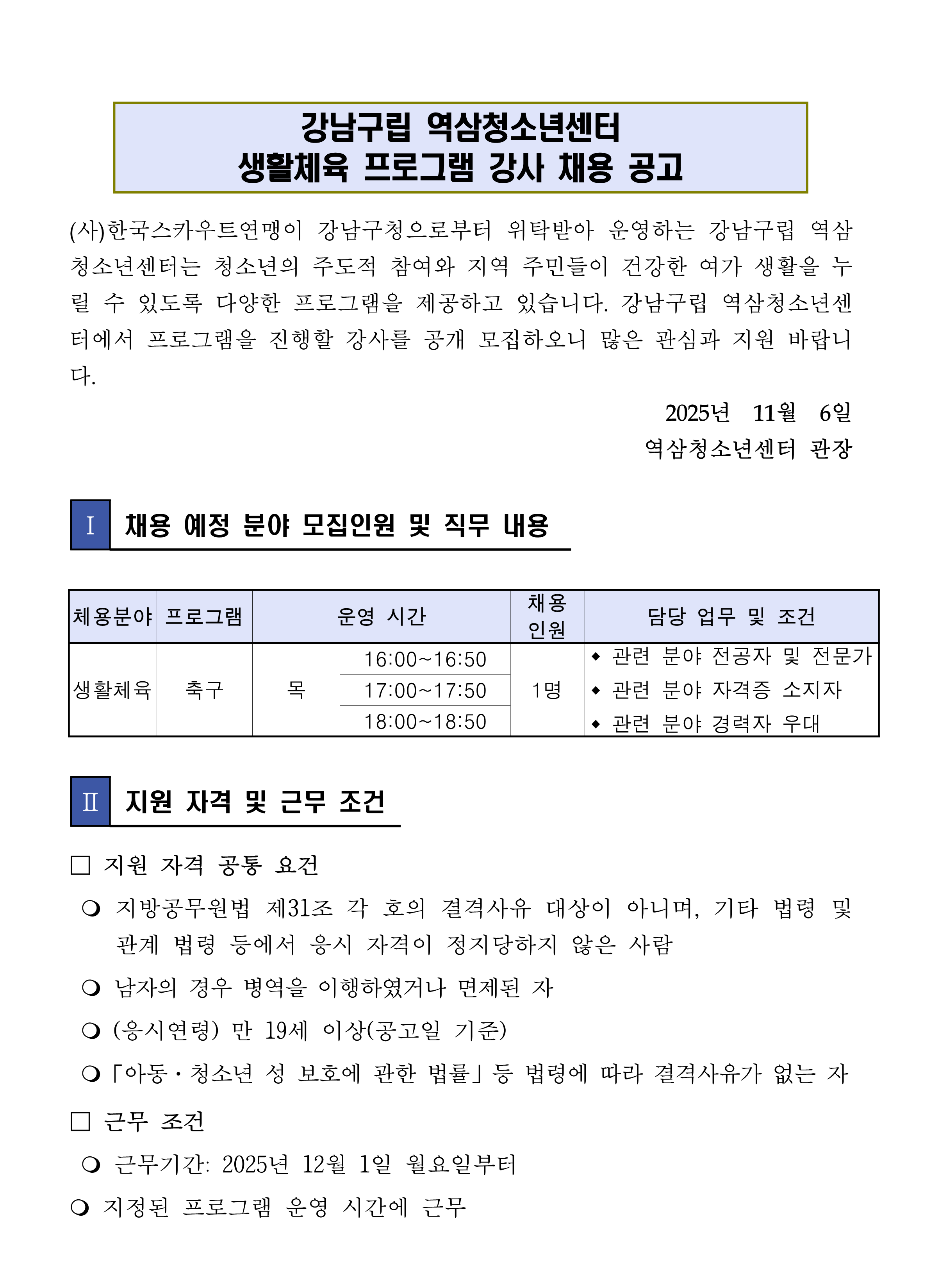 2025년 제7차 역삼청소년센터 직원 채용 공고(유아예체능단, 홍보담당)