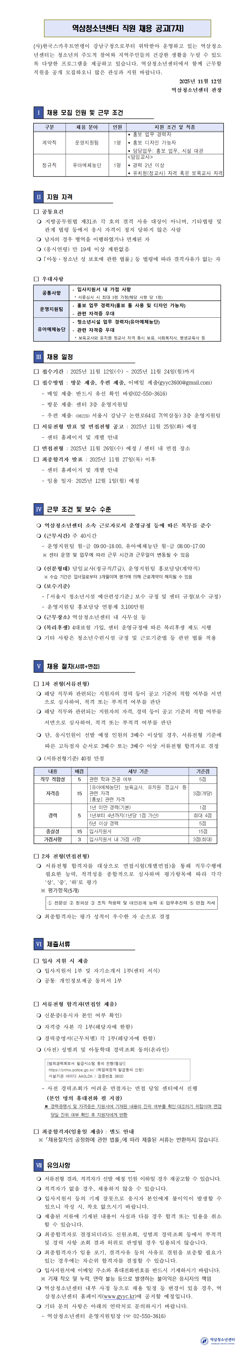 2025년 제7차 역삼청소년센터 직원 채용 공고(유아예체능단, 홍보담당)