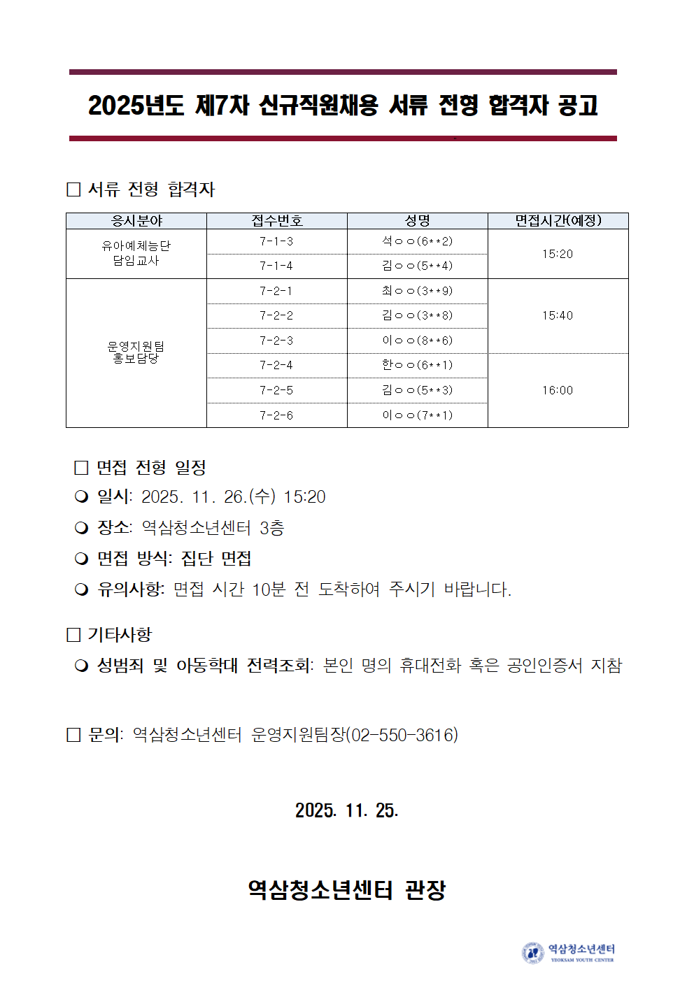 2025년 제7차 신규직원 채용 서류 전형 합격자 공고