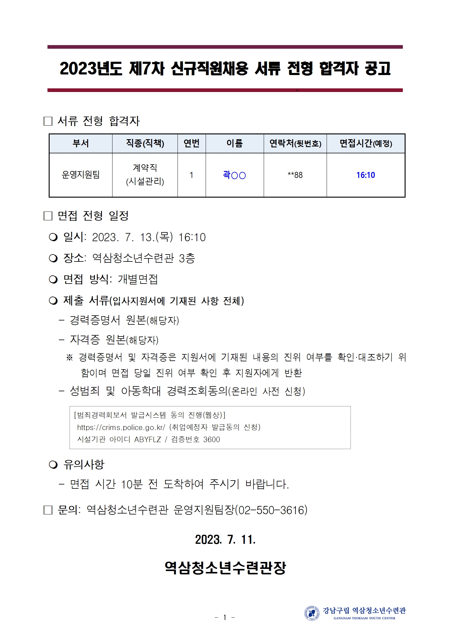 2023년 제7차 역삼청소년수련관 신규직원 채용 서류전형 결과 및 면접 일정 안내