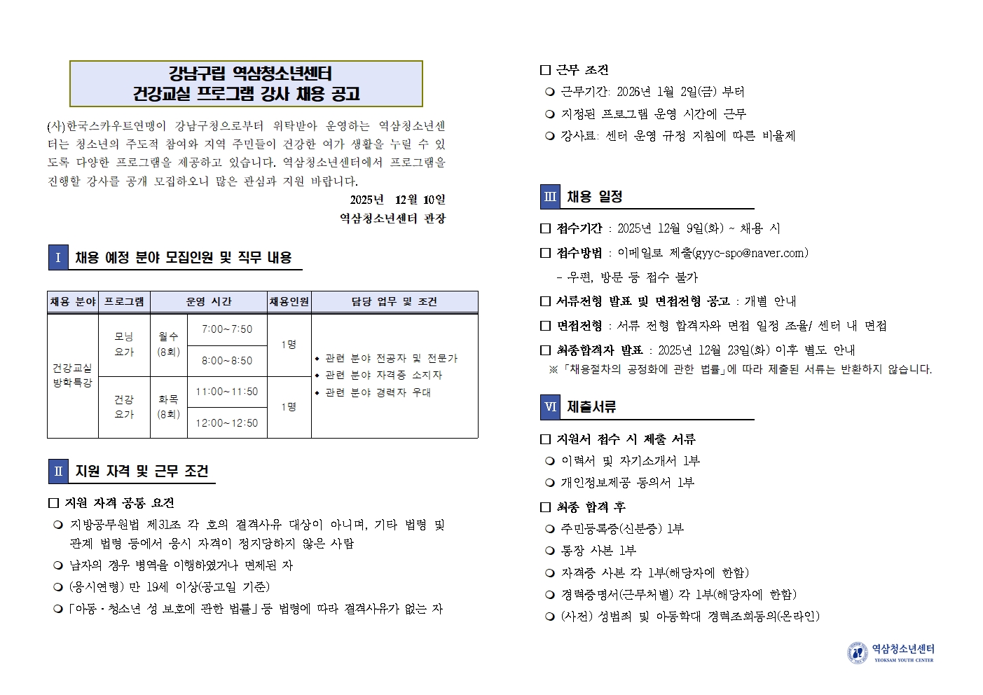 역삼청소년센터 건강교실 프로그램(요가) 강사 채용 공고