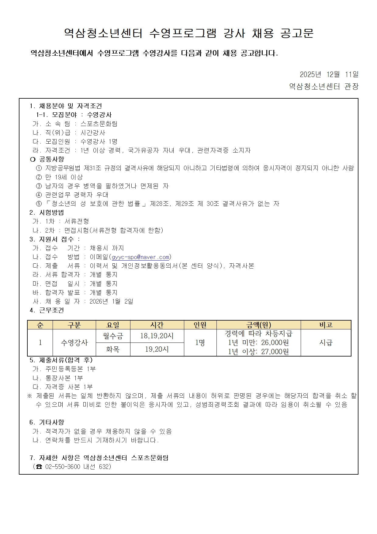 스포츠문화팀 수영장 저녁 수영강사 모집 공고
