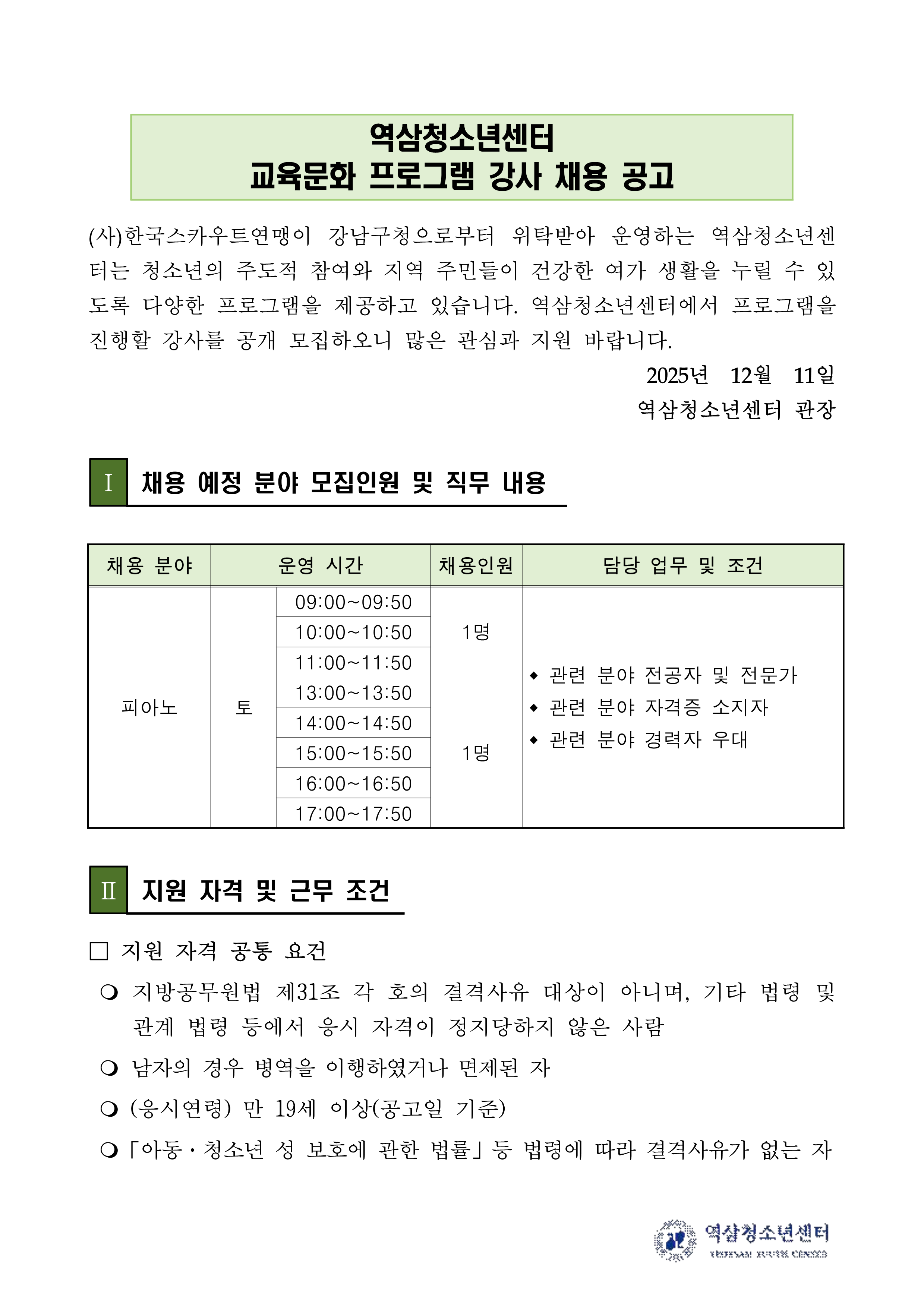 스포츠문화팀 교육문화 프로그램(피아노_토) 강사 채용 공고