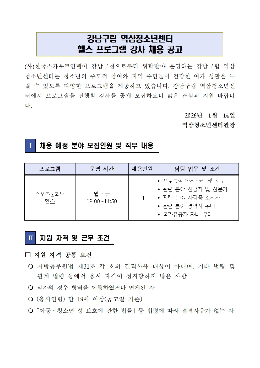 2026년 스포츠문화팀 헬스 프로그램 강사 채용 공고(완료)