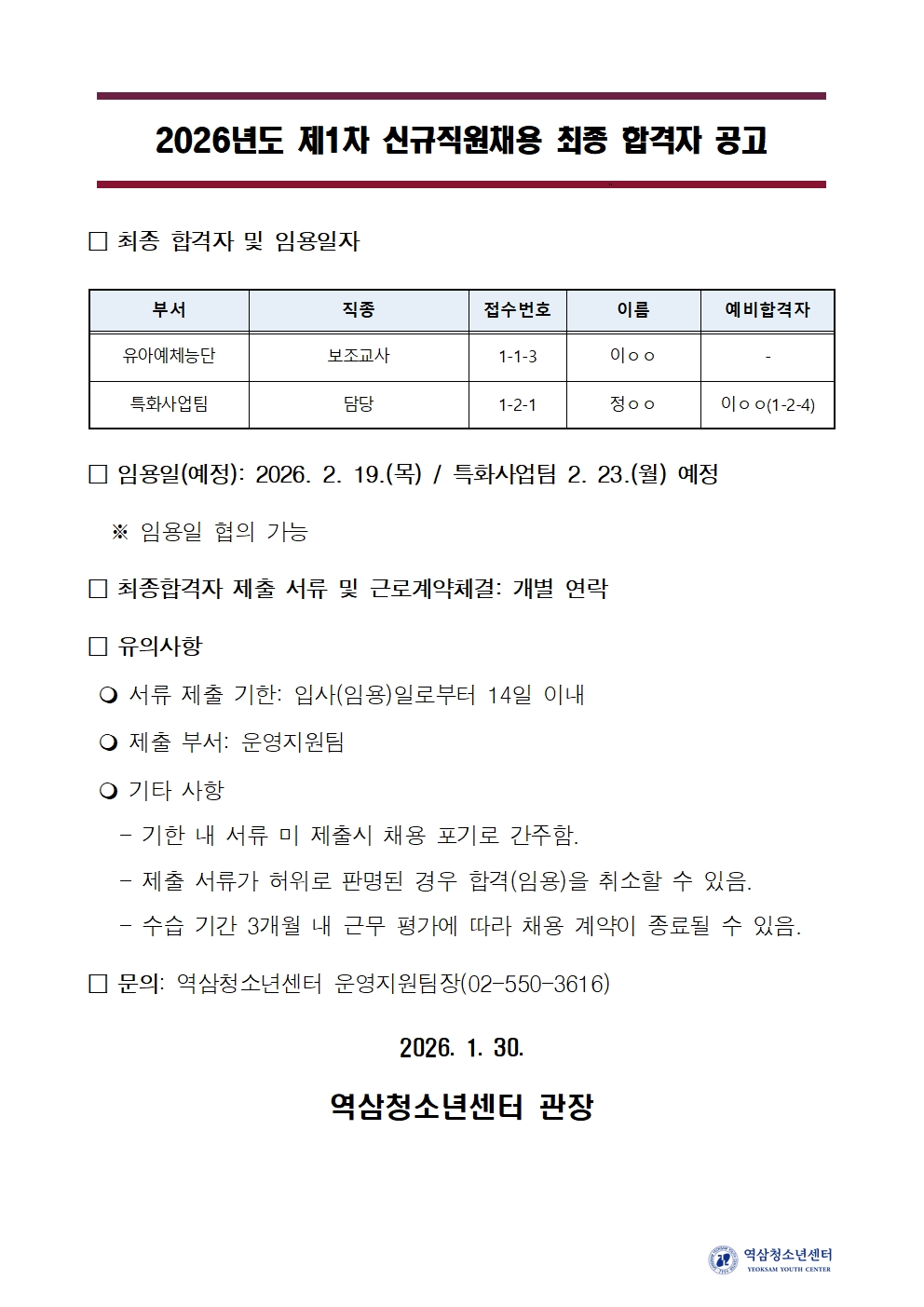 2026년 제1차 직원 채용 최종합격자 공고