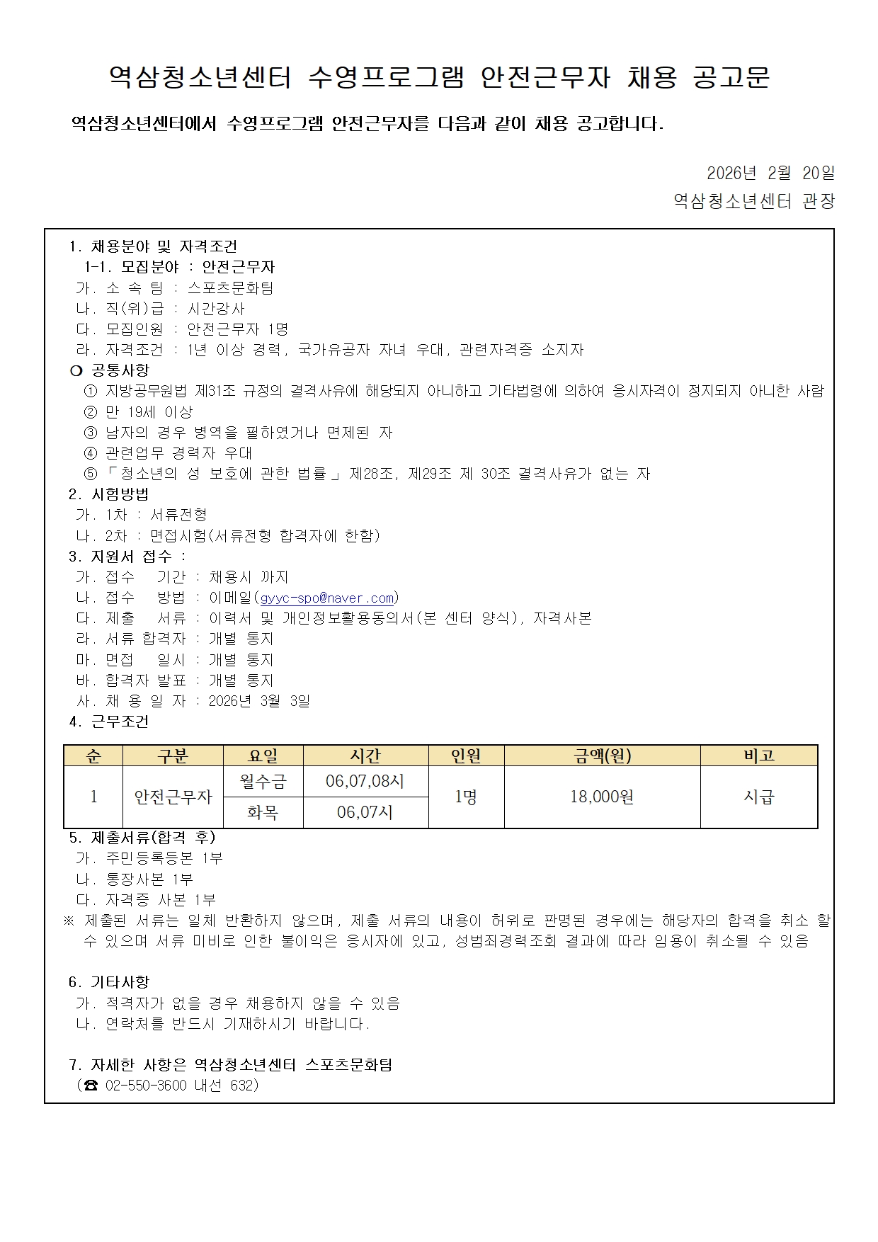 스포츠문화팀 수영프로그램 새벽 안전근무자 채용 공고