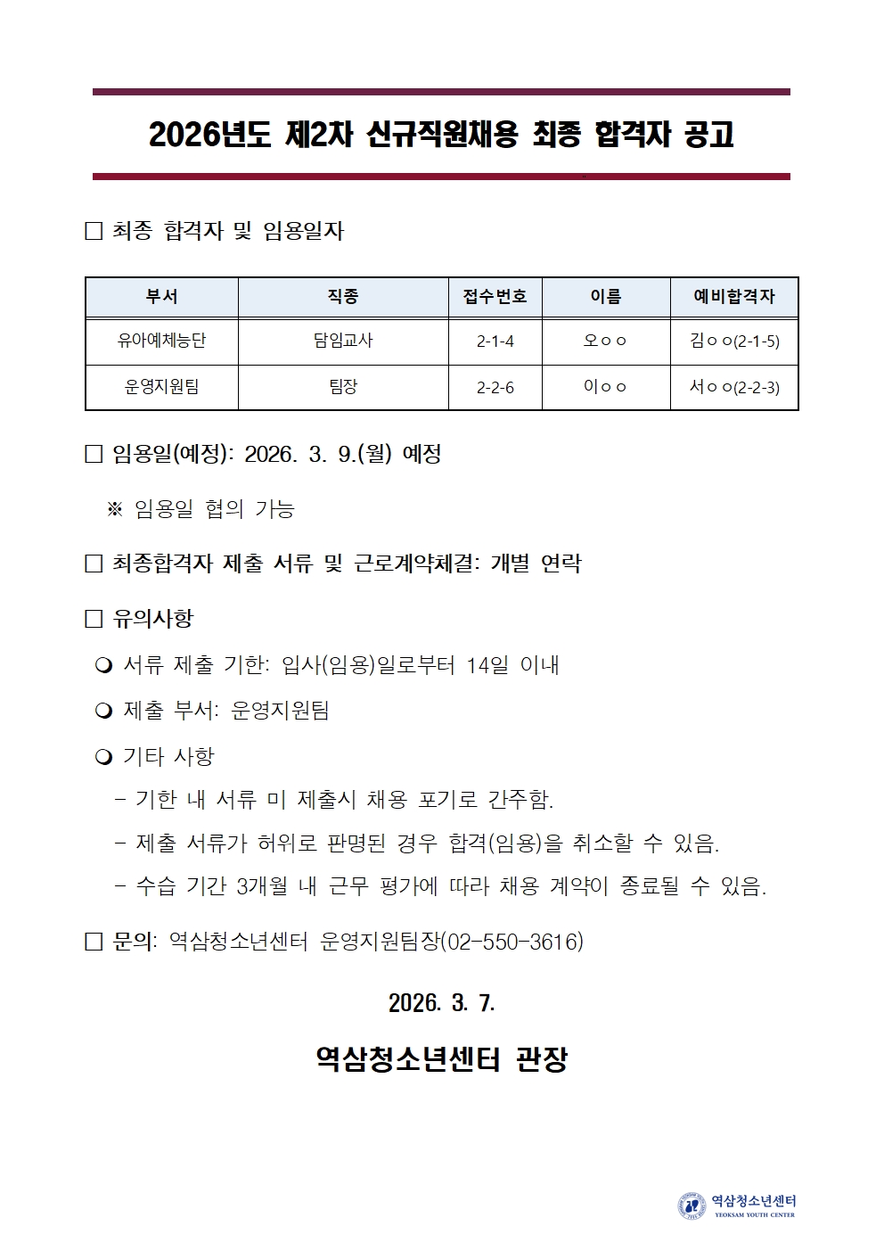 2026년 제2차 신규직원 채용 서류 전형 합격자 공고