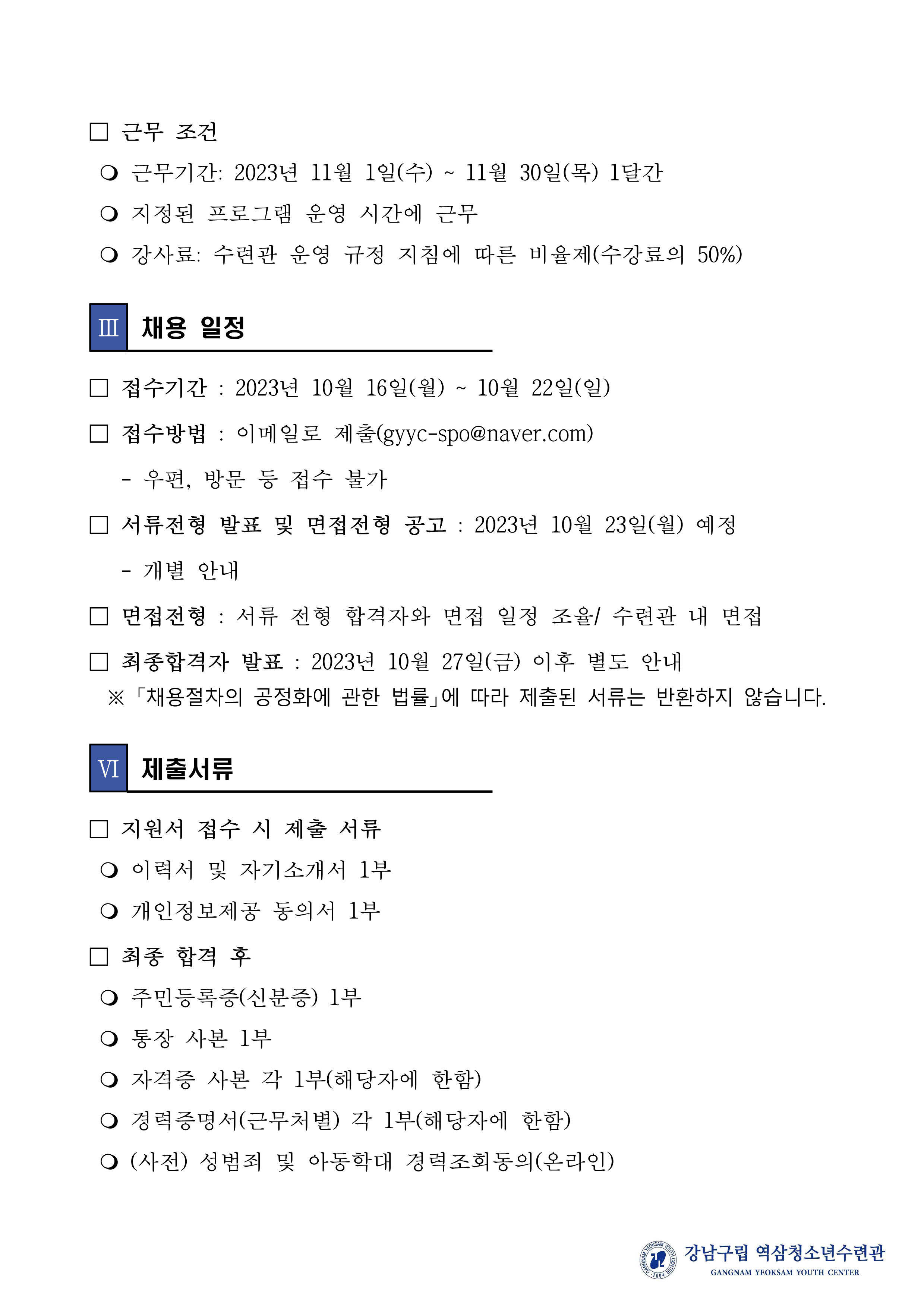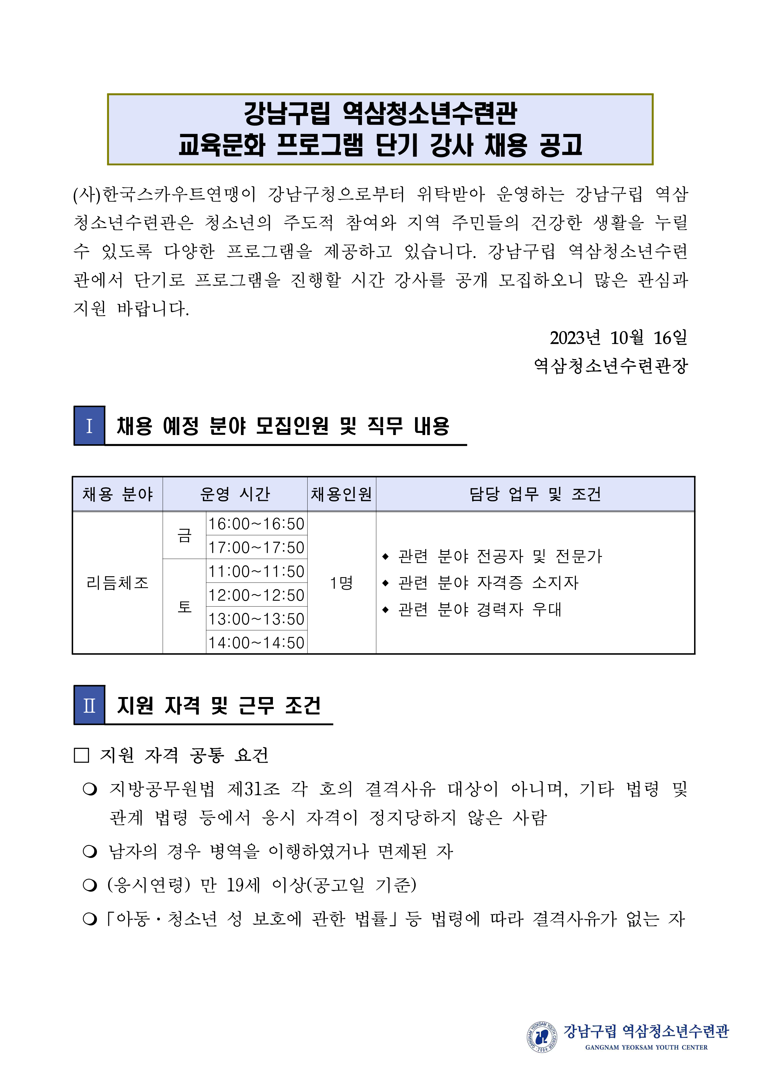 역삼청소년수련관 스포츠문화팀 교육문화 리듬체조 단기 강사 채용 공고