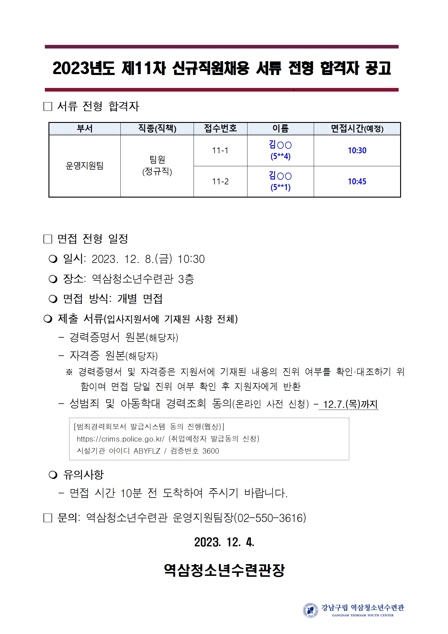 2023년도 제11차 신규직원 채용서류 전형 합격자 공고