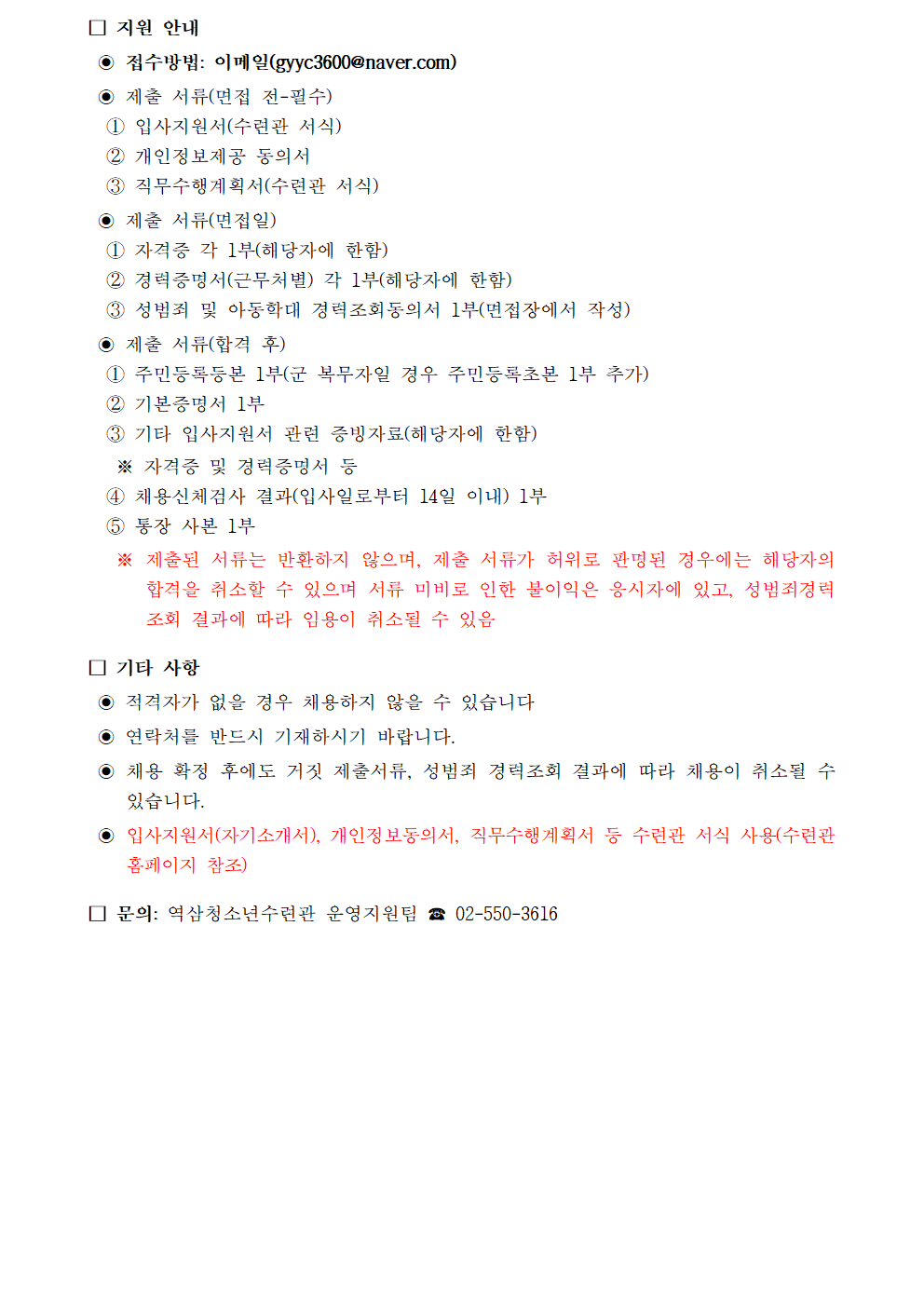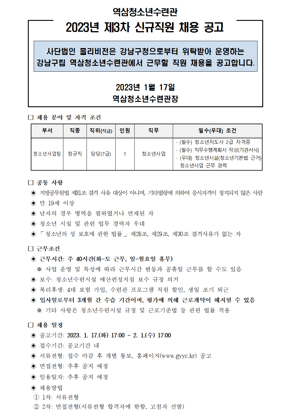 2023년도 제3차 역삼청소년수련관 신규 직원 채용 공고