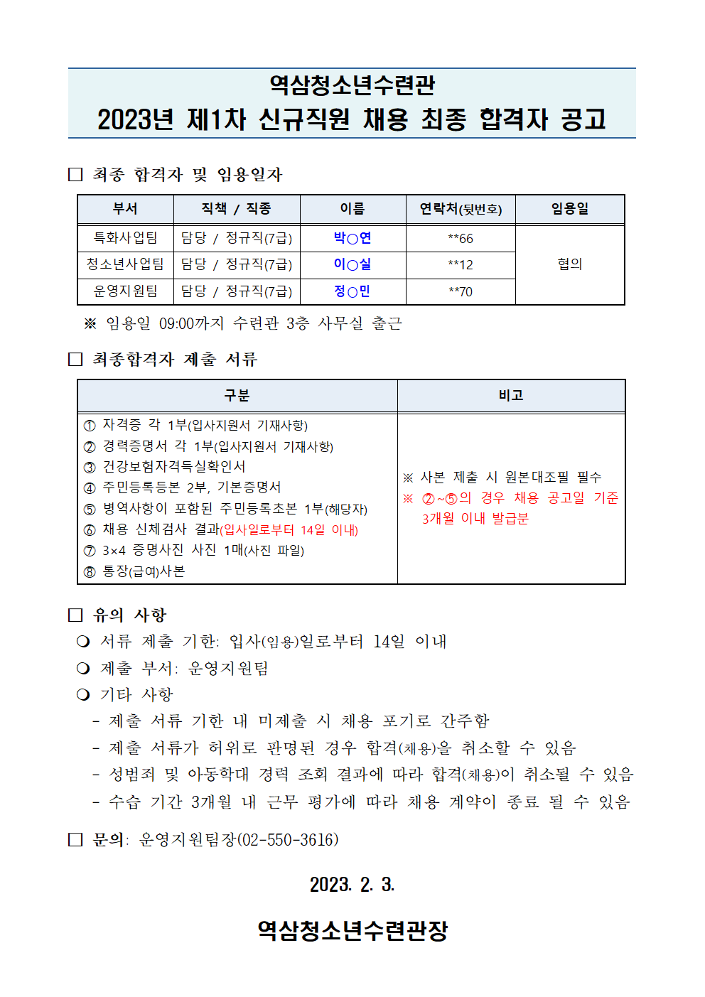 2023년도 제1~3차 신규직원 채용 최종합격자 공고
