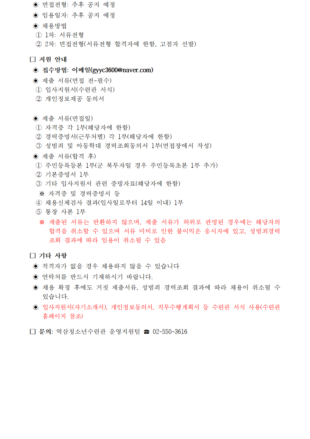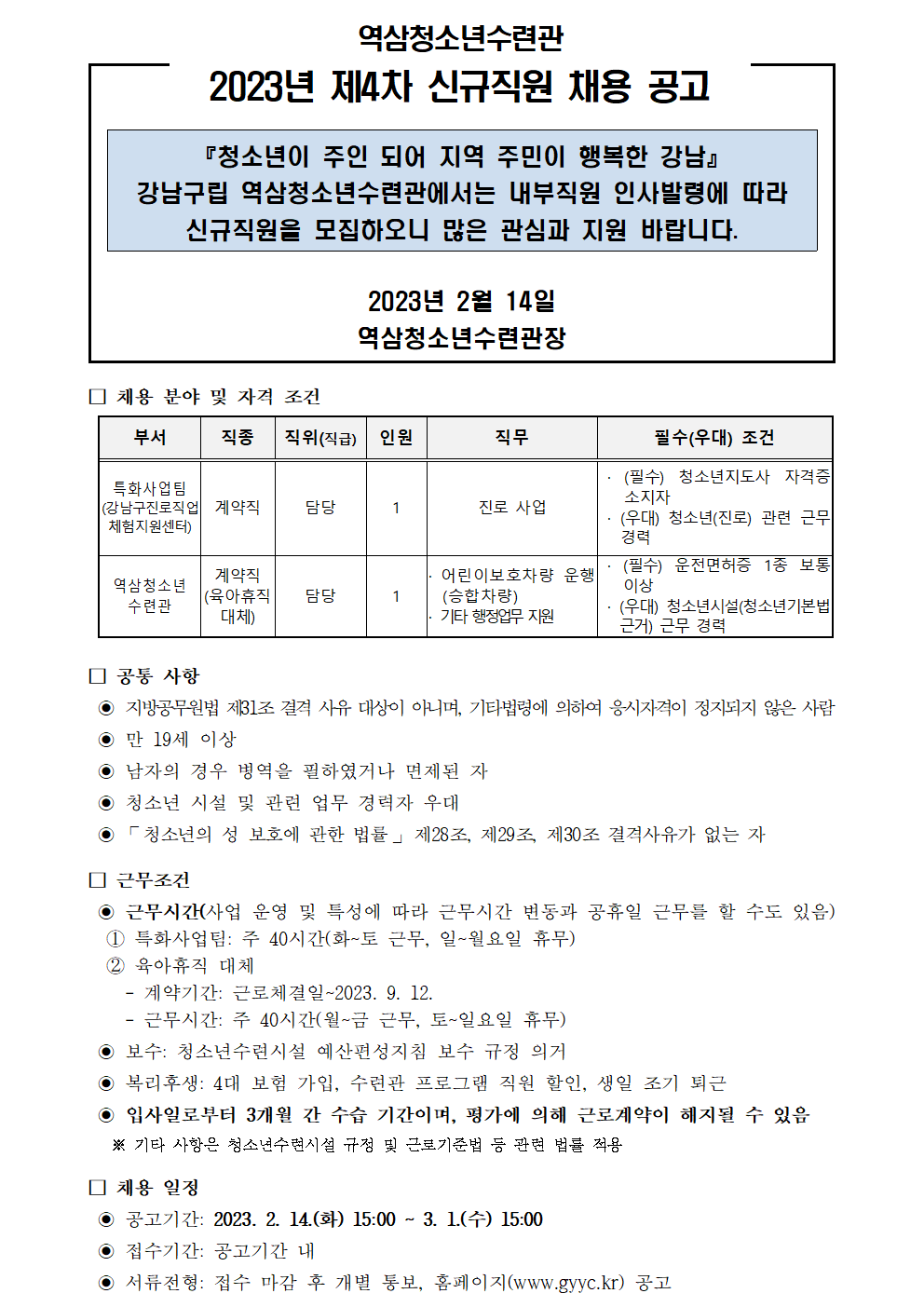 2023년도 제4차 역삼청소년수련관 신규 직원 채용 공고